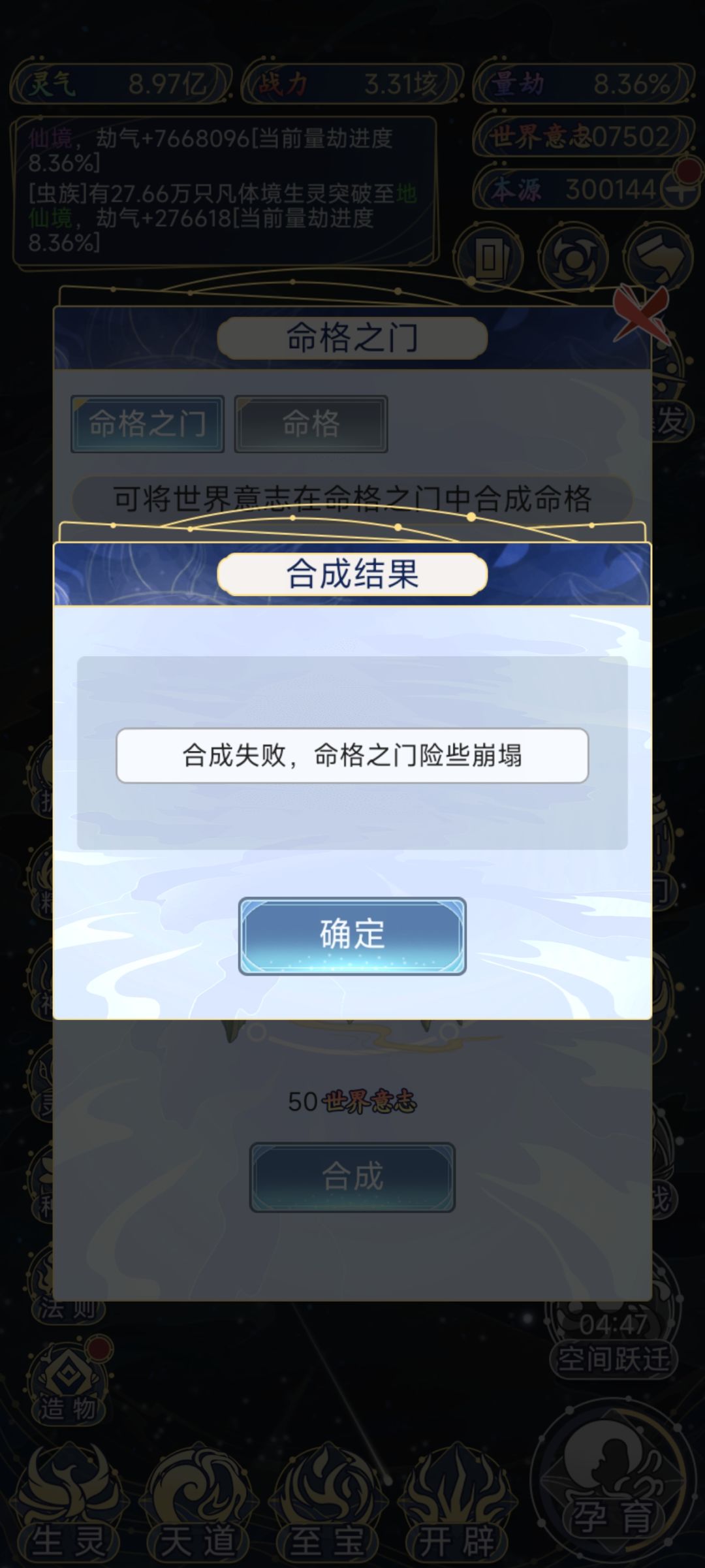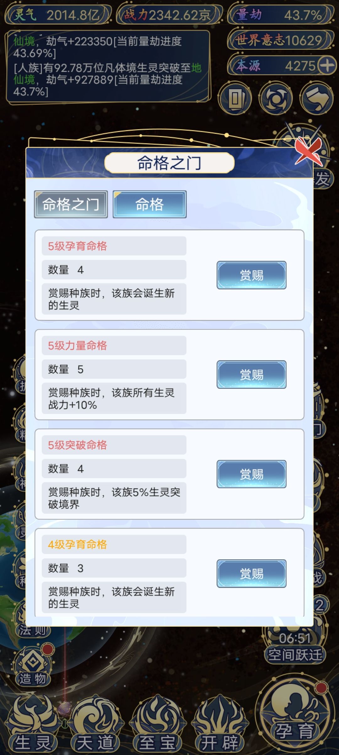 每次花费为50世界意志,还会不出货,命格分3种。 其中突破命格每级突破概率+1%,基础为1%,满级为5%; 1级孕育命格对白色种族的孕育数量为10w,每级加10w,满级加50w白色种族。其余种族每高一级数量/2,红色种族吃5级孕育加15625人口,太拉了; 力量命格每级+2%战力,基础为2%,满级为10%。