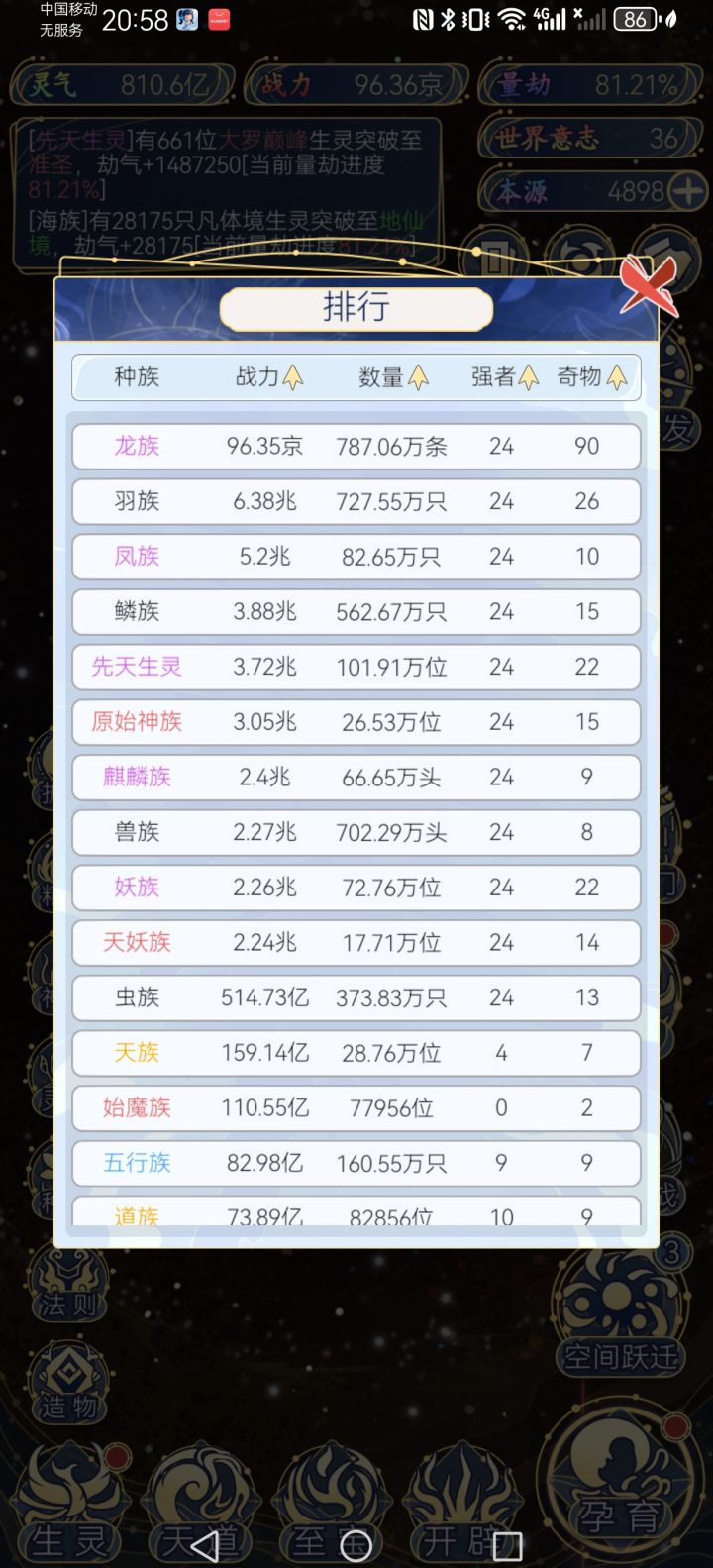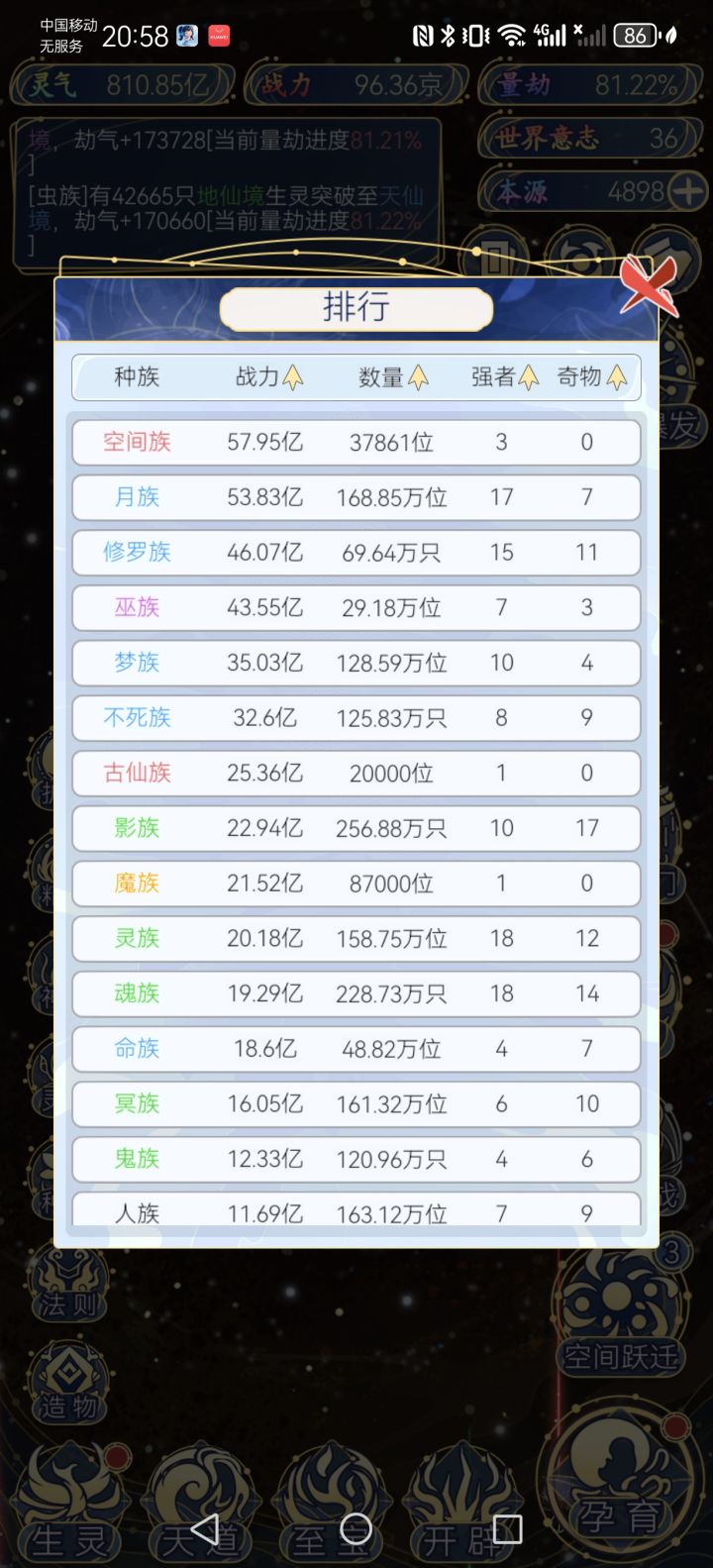 从最开始只养好看的种族,逐渐偏离了轨道,犹豫虫族刷的神物齐物有点多,兽族用于小白鼠灭过一次族。人族16层气运,空间族多少?好像养废了