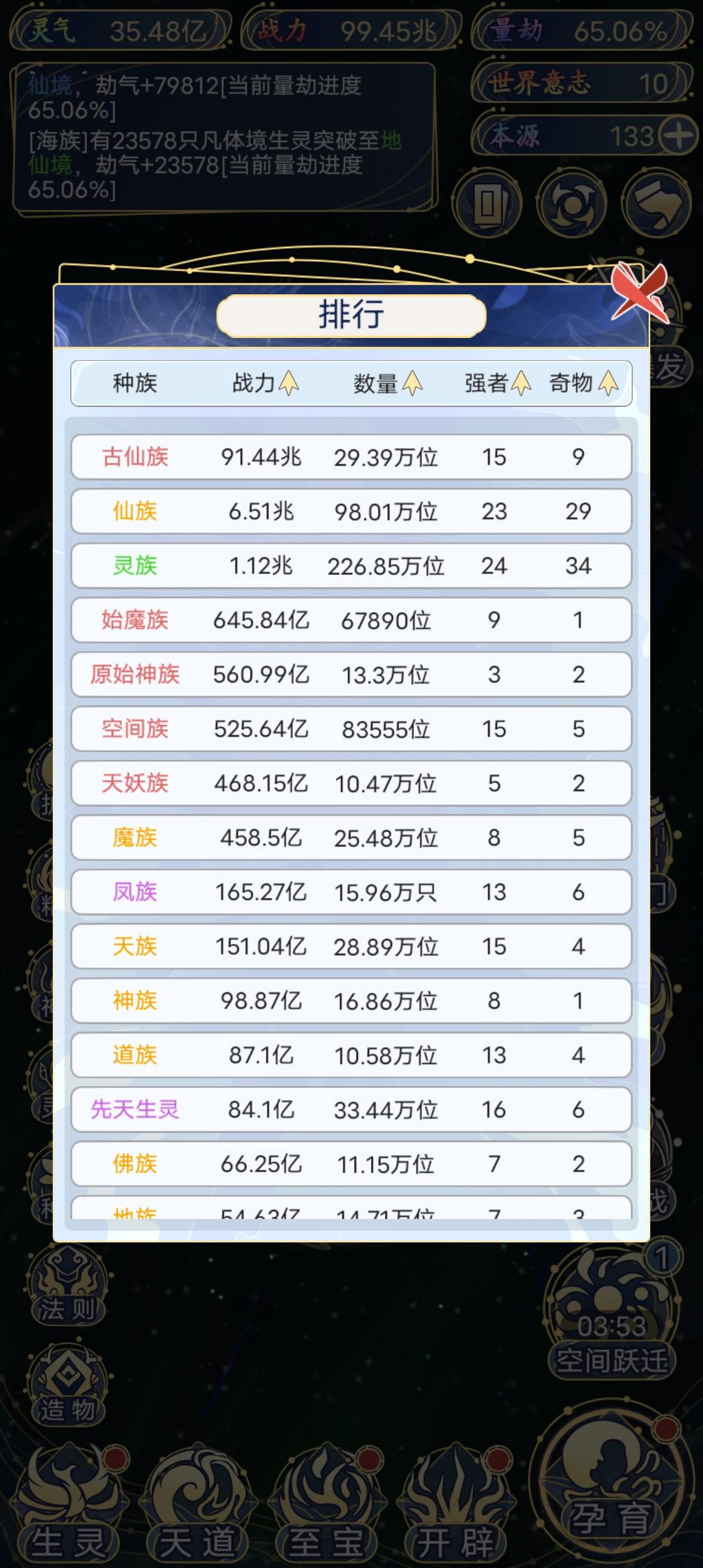 后期不要迷信单种族!不要迷信单种族!不要迷信单种族!前期发展单种族,把血脉和强者集中在一个种族身上,战力提升快。再努力攒世界意志,进入大千世界后就可以发展全种族了,这是迟早的事。每个种族都有上限的,等你把各种族科技树和宝物等级全部升满之后,本源的消耗就下降一大截了,再努力刷人口和域外征战,福佑各种族,战力慢慢就提升起来了。后期就是看广告、空间跃迁、灵气转化本源、灵气刷人口、域外征战、刷圣人