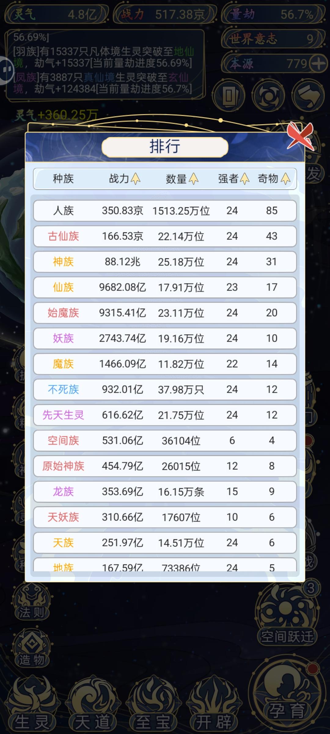 #游戏攻略 灭人族的提战思路…首先后期战力主要靠福佑和圣人巅峰数量,,而福佑和战力挂钩,福佑上限可以通过吸收宇宙能量获取,这里截图我是刚灭人族,古仙族还没有吃过能量所以上限只有初始的5,,所以最重要的是圣人巅峰的数量,而数量提升速度是很有限的,所以要靠质量,红色是最高质量~所以可以后期培养红色种族过100兆能吃宇宙能量就可以灭人族1:人族培养第一个圣人巅峰大概是到十京级,后面就要通过数量到更多的