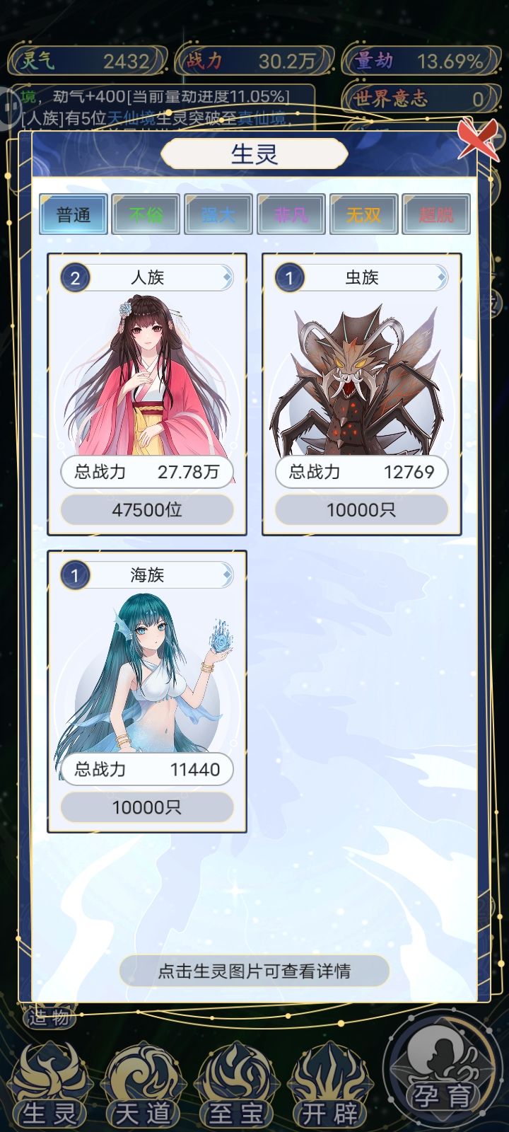 这边也是玩了一段时间啊 想培养其他种族来着 奈何人族太强了 十二倍气运实力4096倍 超脱族最低一气运都要1000亿 人族就1亿