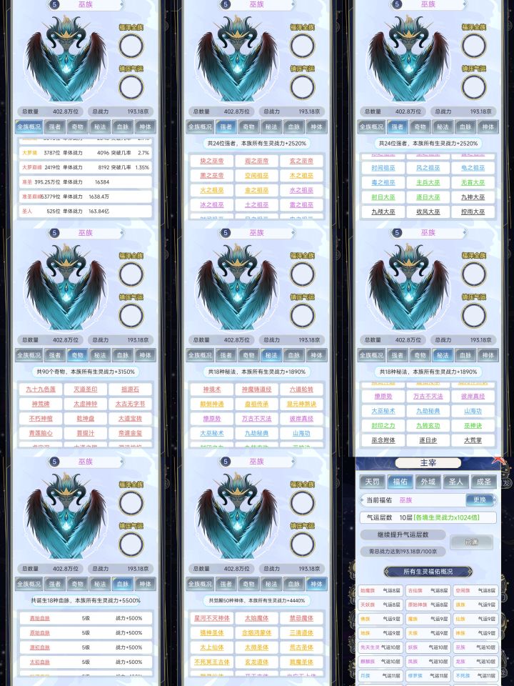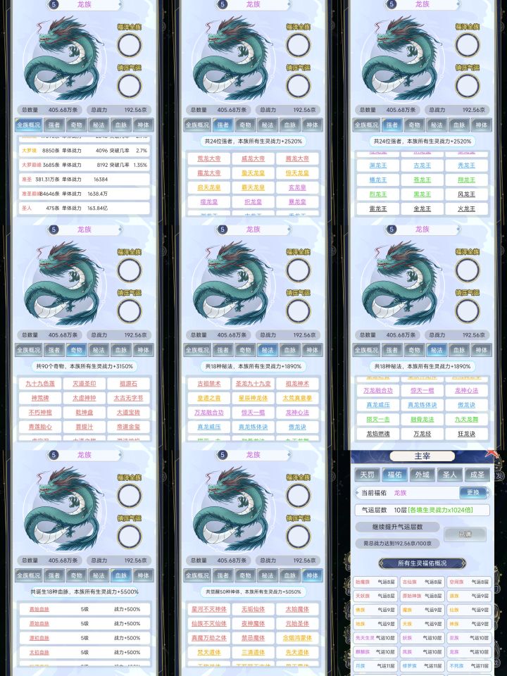 1 开局 首先,孕育里面只会出现你刷出的种族相关的,比如你就输出了一个人族,那么他只会有五个选项,第一,孕育生灵(可能继续孕育人族,也可能输出新种族),第二,转化本源(你的世界等级越高,给的本源越多,最高等级一次给14),第三,福泽生灵(给福泽的种族选一部分升级),第四,启示生灵(给你刷出的种族里随机出现强者,加种族伤害),第五,诞生血脉(总共18种,刷出相同的可以升级了刷满需要18*5就是90