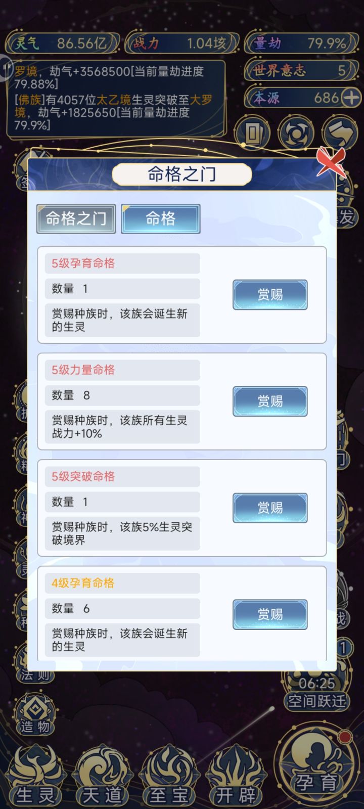 1.开局 单人族 结阵:提升吸收灵气收益 01.本源使用 (来源:世界裂隙-转化-在线时间-广告) 生灵等级-圣体(满级50) 至宝(镇压气运>福泽全族) 开辟(往生塔-灵气世界优先) 02.世界意志使用 (来源:破碎的世界) 优先升级天道>法则(造化>轮回>力量>孕育) 炼化世界(增加战力) 命格之门 50合成 后期开启 唯一可用之处 03.孕育 诞生血脉>转化本源>福泽>启