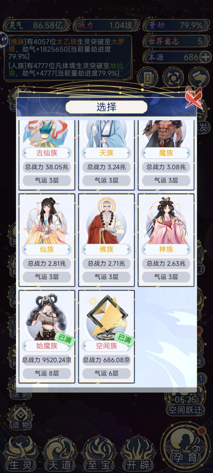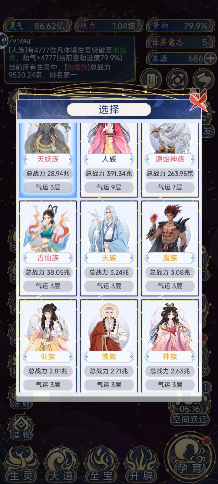 这边也是玩了一段时间啊 想培养其他种族来着 奈何人族太强了 十二倍气运实力4096倍 超脱族最低一气运都要1000亿 人族就1亿