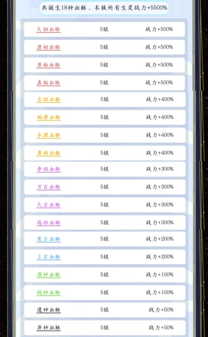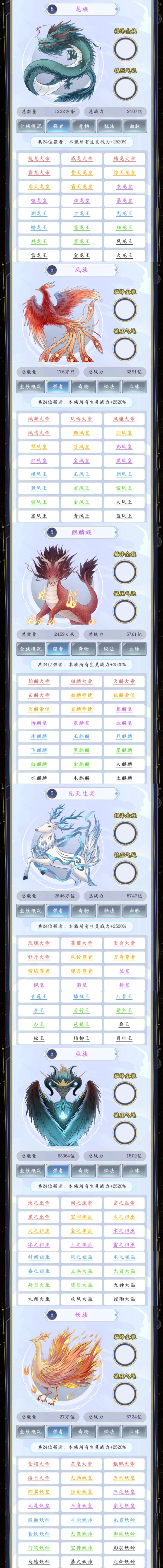 刚肝完,看着没人做图鉴来弄一个,强者有数的,跟着种族一起做了,只能放九张图,同级别的拼了一下,血脉和世界模型在最后。普通:人族,海族,羽族,鳞族,兽族,虫族不俗:魅族,魂族,灵族,鬼族,影族,冥族强大:梦族,月族,不死族,修罗族,命族,五行族非凡:龙族,凤族,麒麟族,先天生灵,巫族,妖族无双:仙族,神族,天族,地族,佛族,道族,魔族超脱:古仙族,始魔族,原始神族,天妖族,空间族#攻略