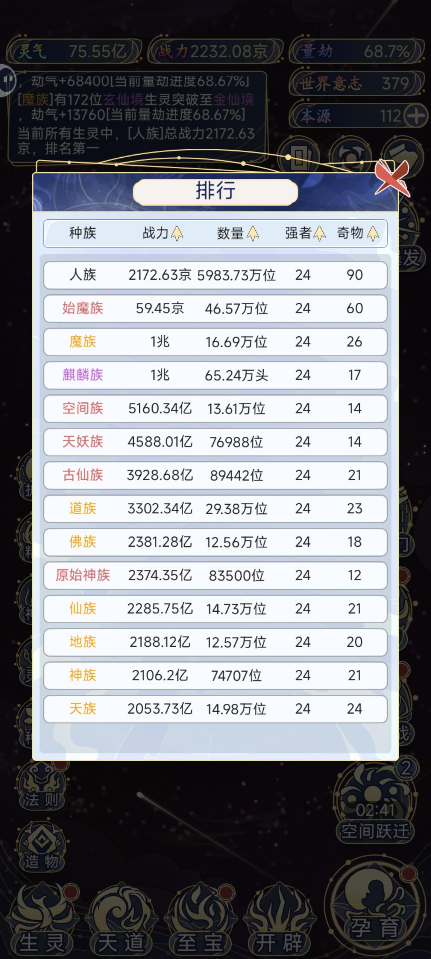 1.开局 单人族 结阵:提升吸收灵气收益 01.本源使用 (来源:世界裂隙-转化-在线时间-广告) 生灵等级-圣体(满级50) 至宝(镇压气运>福泽全族) 开辟(往生塔-灵气世界优先) 02.世界意志使用 (来源:破碎的世界) 优先升级天道>法则(造化>轮回>力量>孕育) 炼化世界(增加战力) 命格之门 50合成 后期开启 唯一可用之处 03.孕育 诞生血脉>转化本源>福泽>启