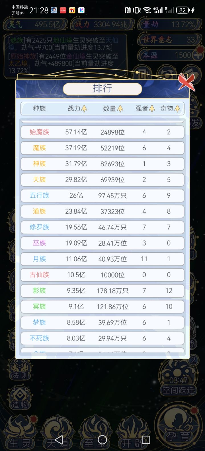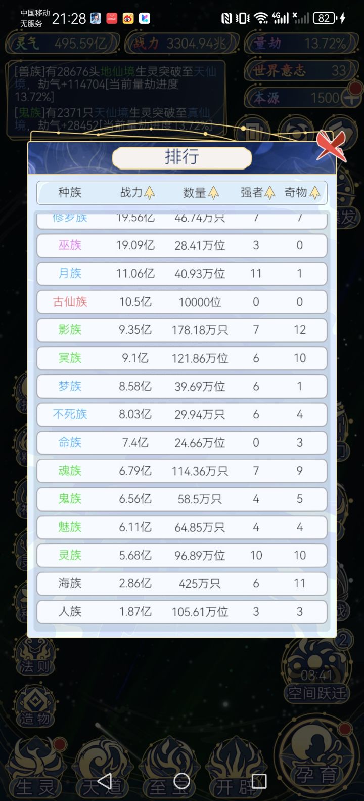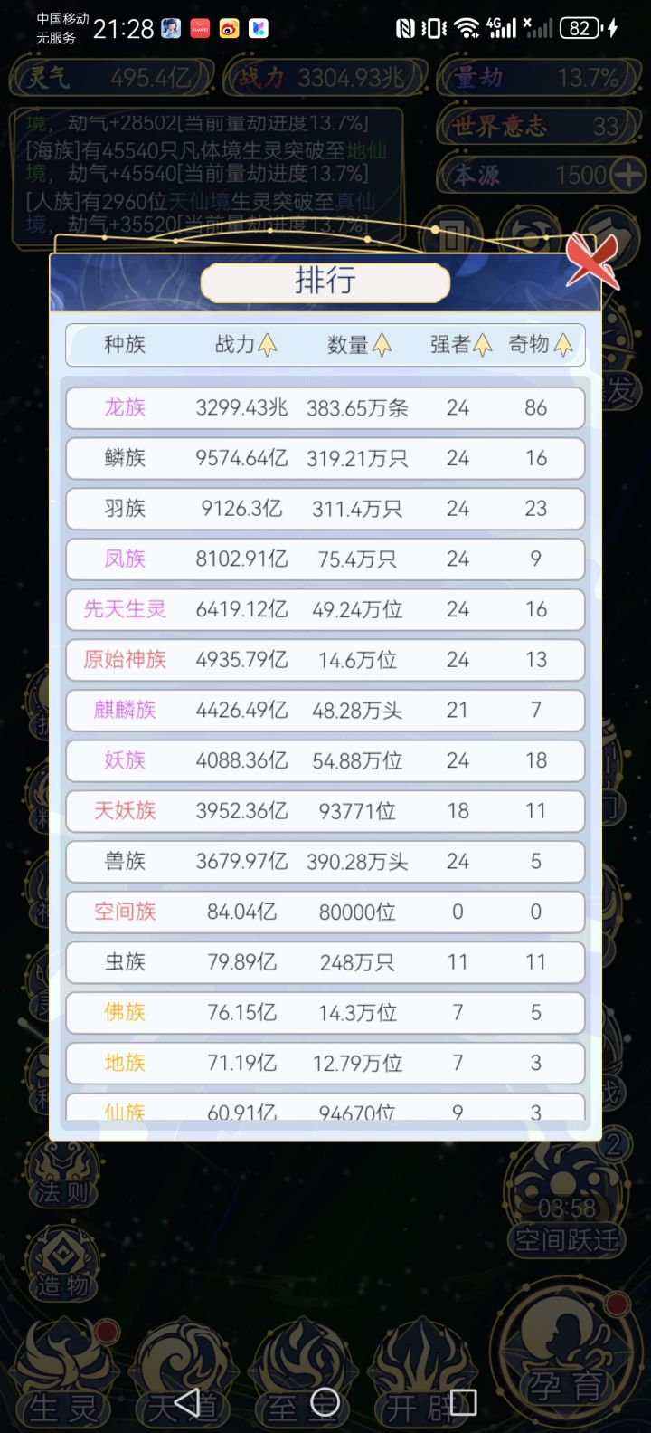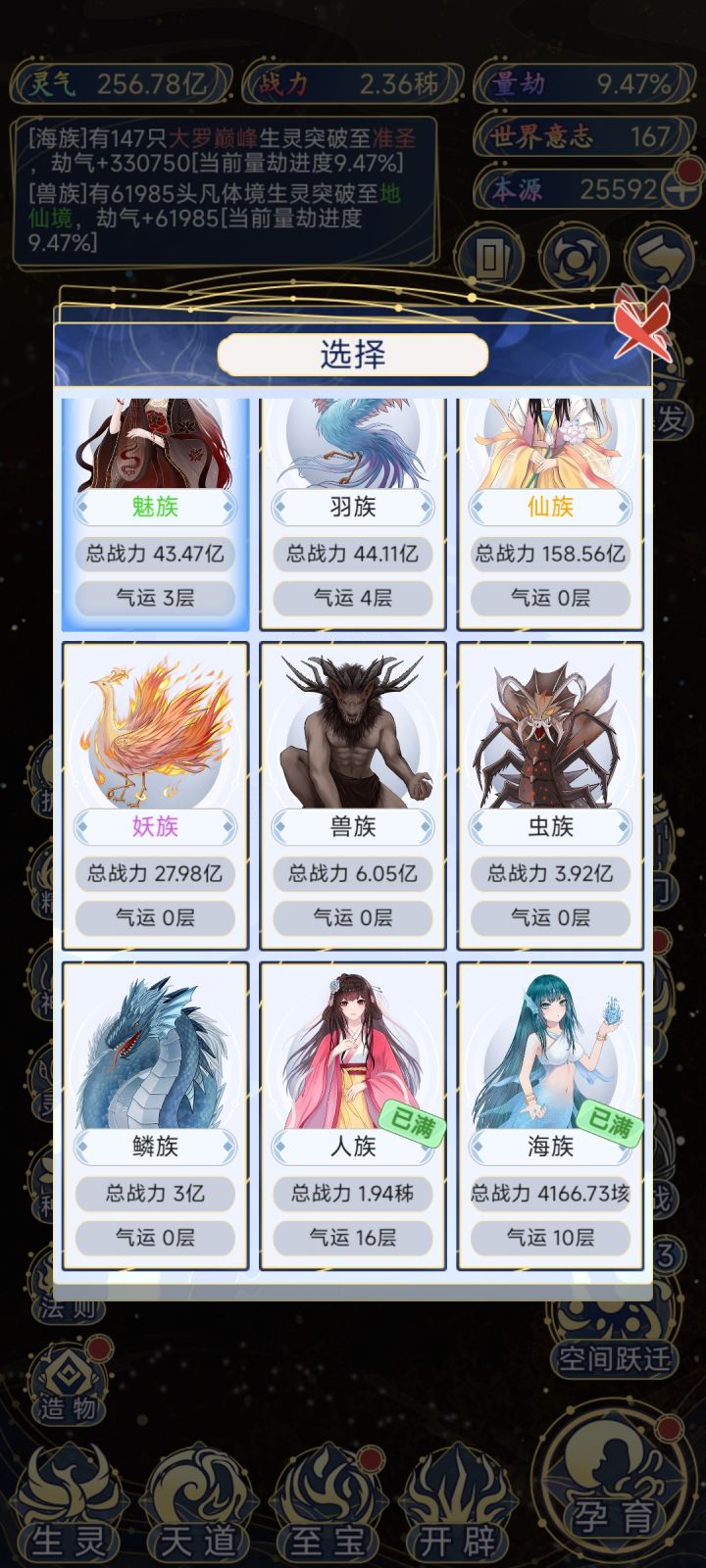 这边也是玩了一段时间啊 想培养其他种族来着 奈何人族太强了 十二倍气运实力4096倍 超脱族最低一气运都要1000亿 人族就1亿