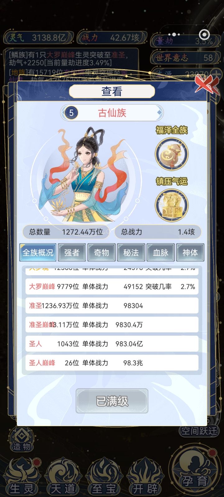 这边也是玩了一段时间啊 想培养其他种族来着 奈何人族太强了 十二倍气运实力4096倍 超脱族最低一气运都要1000亿 人族就1亿
