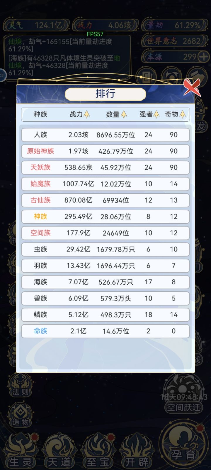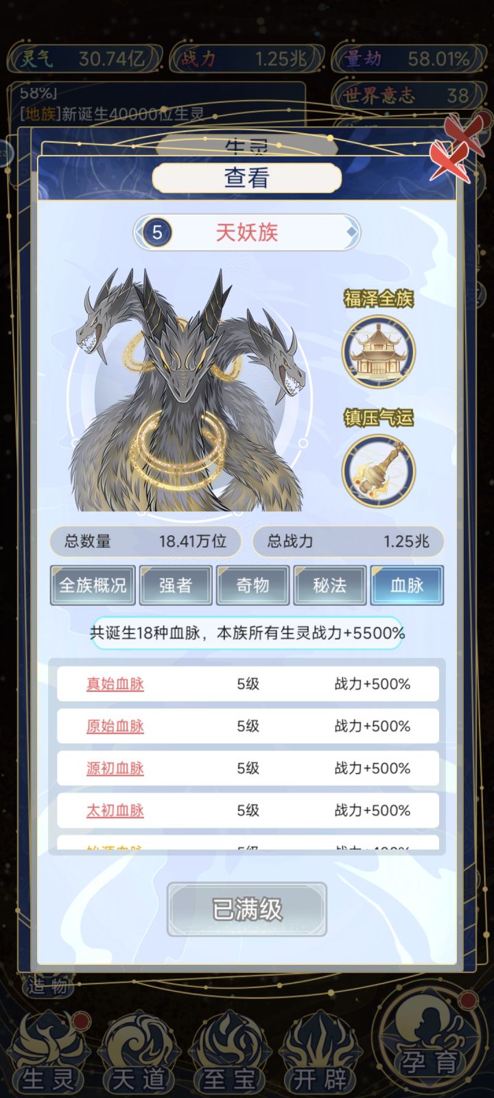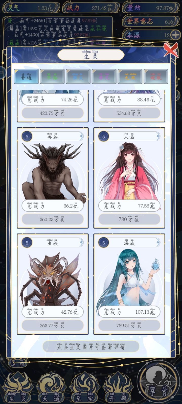 1 开局 首先,孕育里面只会出现你刷出的种族相关的,比如你就输出了一个人族,那么他只会有五个选项,第一,孕育生灵(可能继续孕育人族,也可能输出新种族),第二,转化本源(你的世界等级越高,给的本源越多,最高等级一次给14),第三,福泽生灵(给福泽的种族选一部分升级),第四,启示生灵(给你刷出的种族里随机出现强者,加种族伤害),第五,诞生血脉(总共18种,刷出相同的可以升级了刷满需要18*5就是90