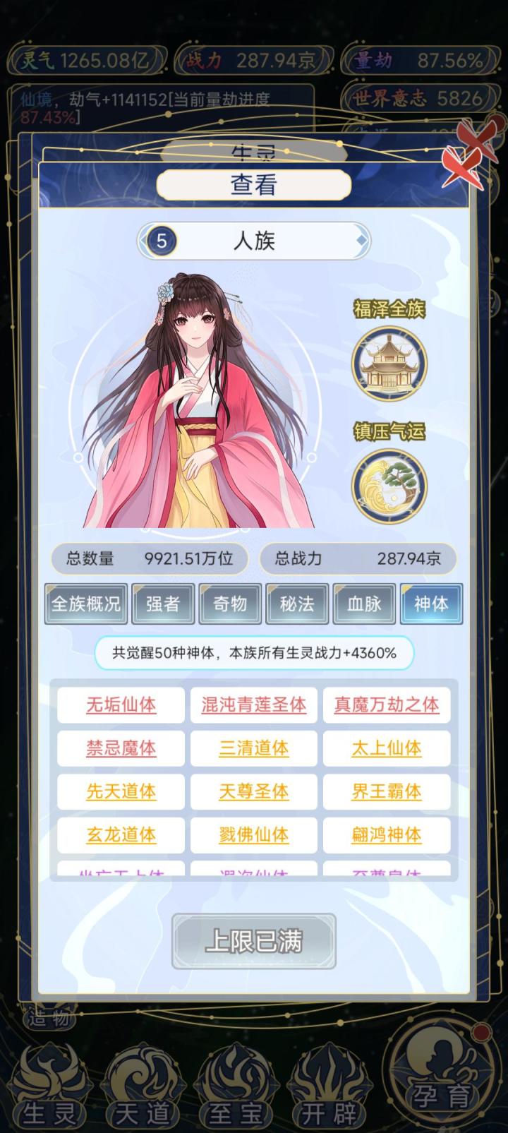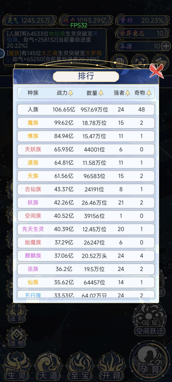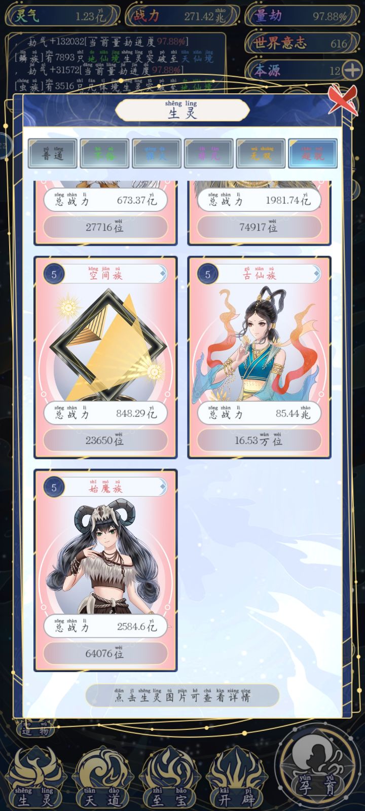 1 开局 首先,孕育里面只会出现你刷出的种族相关的,比如你就输出了一个人族,那么他只会有五个选项,第一,孕育生灵(可能继续孕育人族,也可能输出新种族),第二,转化本源(你的世界等级越高,给的本源越多,最高等级一次给14),第三,福泽生灵(给福泽的种族选一部分升级),第四,启示生灵(给你刷出的种族里随机出现强者,加种族伤害),第五,诞生血脉(总共18种,刷出相同的可以升级了刷满需要18*5就是90