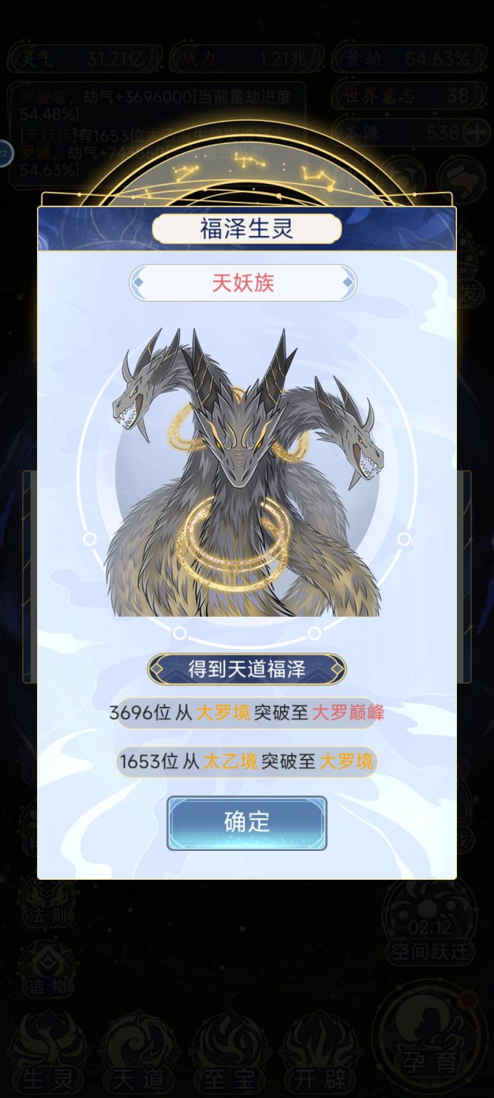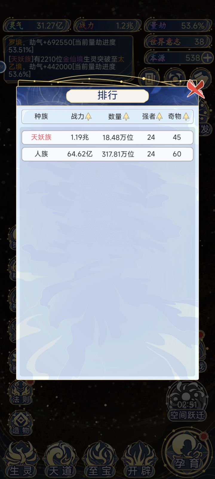 开局不要孕育生灵,单养一个人族就可以,灵活运用时间大法直到诸神对决可以随便孕育一个生灵,让人族快速增加人口,大千世界之前不要点法则,优先点轮回法则每次升级天道世界先把增加灵气点满,直到开启生灵大对决的时候就可以孕育10个生灵让人族1打10,通常一次能有2-3个成圣人,200圣人后,圣人巅峰100%成功,多用时间大法红色种族基础福佑满级5层,吃宇宙能量最高8层,比人族福佑15层属性要高一些,人
