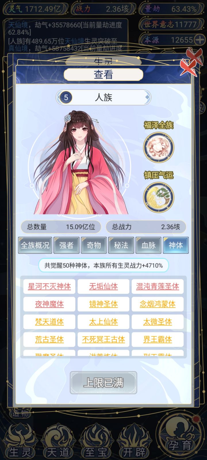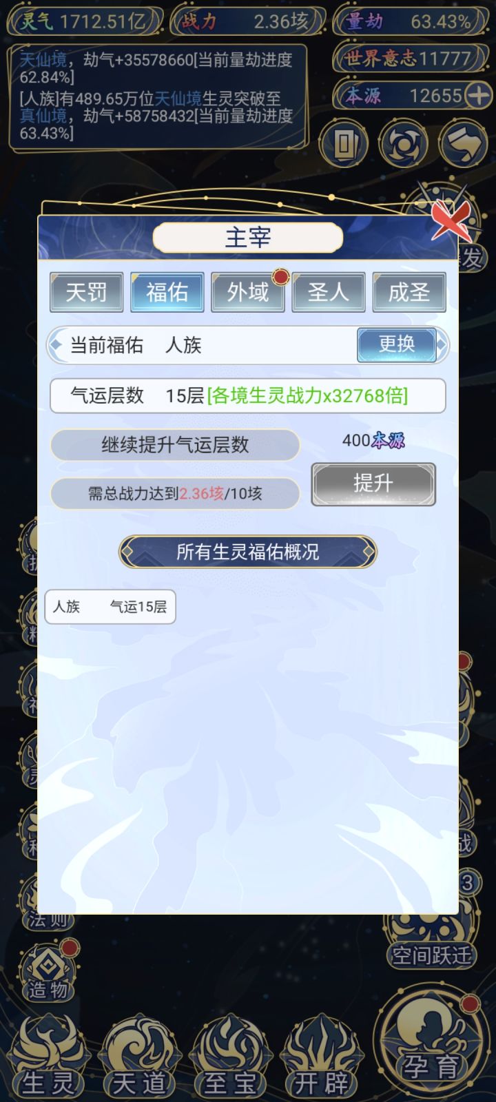 这边也是玩了一段时间啊 想培养其他种族来着 奈何人族太强了 十二倍气运实力4096倍 超脱族最低一气运都要1000亿 人族就1亿