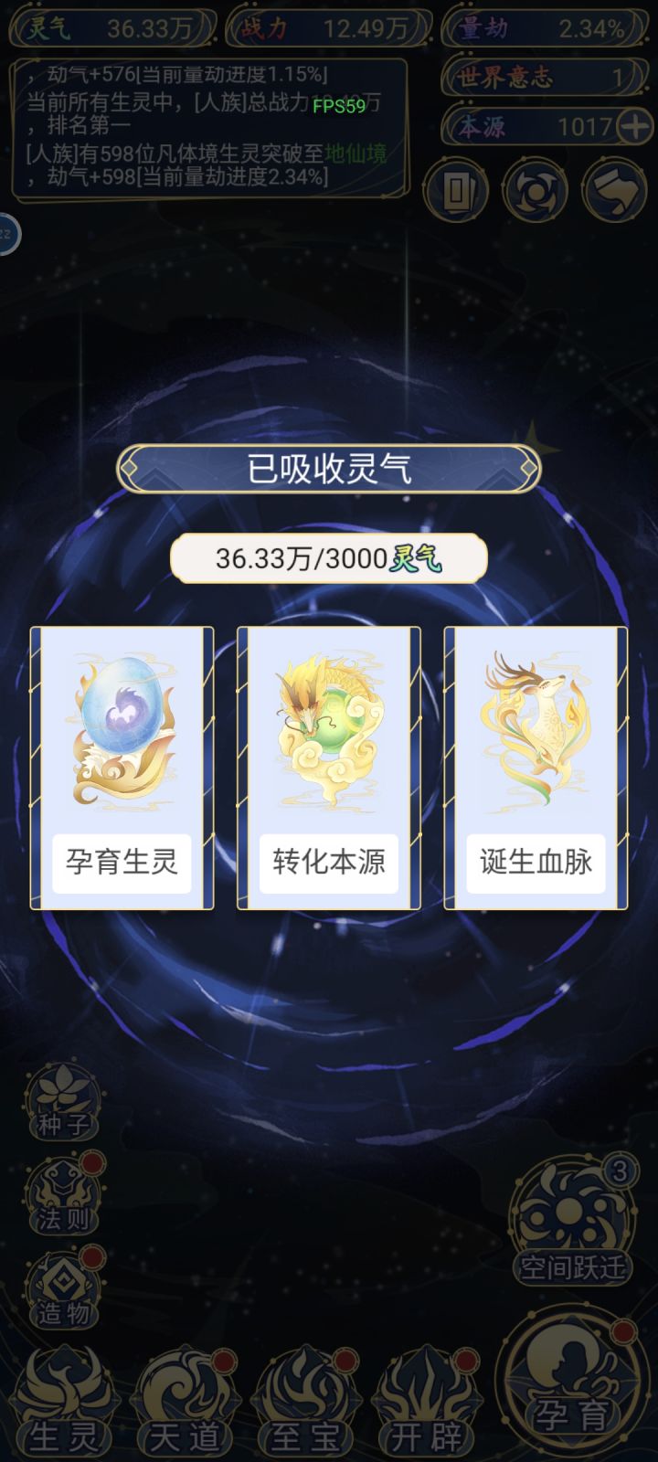 单人族攻略开局:新手引导孕育出人族选择跳过(图1),提示开放新功能空间裂缝,不用管它点击左下角生灵上方造物(图2),这样会有一半几率造出镇压气运类法宝,比战力法宝有用。(图3)然后分屏到设置—系统管理—日期与时间,将时间调后一日(图4),点击右下角孕育,有红点就点,优先血脉,次选福泽,不点孕育生灵和转化本源(图5),孕育之后点击右上角本源右侧的红点加号领取本源,收集完资源后跃迁。之后再切设置重复