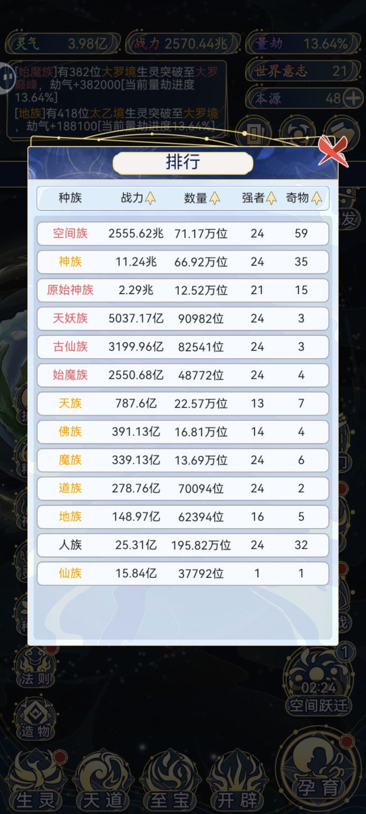 这边也是玩了一段时间啊 想培养其他种族来着 奈何人族太强了 十二倍气运实力4096倍 超脱族最低一气运都要1000亿 人族就1亿