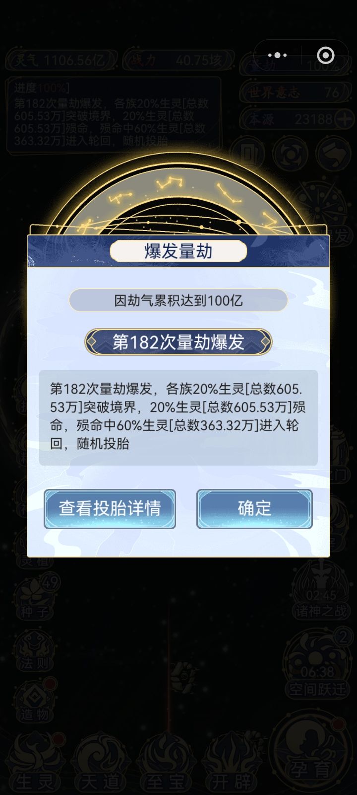 1.开局 单人族 结阵:提升吸收灵气收益 01.本源使用 (来源:世界裂隙-转化-在线时间-广告) 生灵等级-圣体(满级50) 至宝(镇压气运>福泽全族) 开辟(往生塔-灵气世界优先) 02.世界意志使用 (来源:破碎的世界) 优先升级天道>法则(造化>轮回>力量>孕育) 炼化世界(增加战力) 命格之门 50合成 后期开启 唯一可用之处 03.孕育 诞生血脉>转化本源>福泽>启