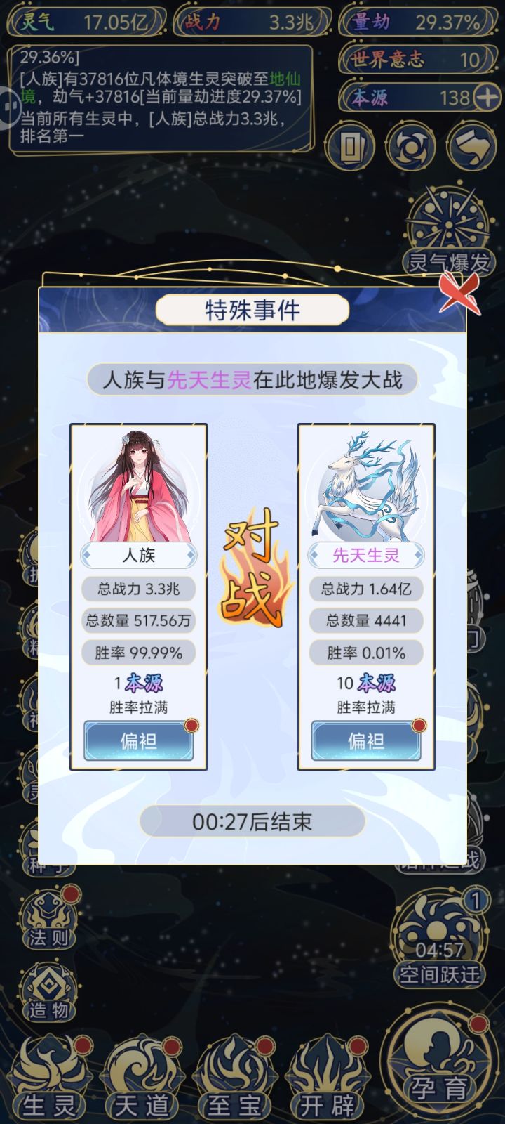 这边也是玩了一段时间啊 想培养其他种族来着 奈何人族太强了 十二倍气运实力4096倍 超脱族最低一气运都要1000亿 人族就1亿