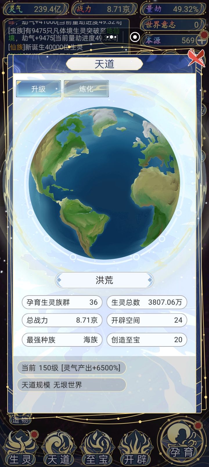 1.开局 单人族 结阵:提升吸收灵气收益 01.本源使用 (来源:世界裂隙-转化-在线时间-广告) 生灵等级-圣体(满级50) 至宝(镇压气运>福泽全族) 开辟(往生塔-灵气世界优先) 02.世界意志使用 (来源:破碎的世界) 优先升级天道>法则(造化>轮回>力量>孕育) 炼化世界(增加战力) 命格之门 50合成 后期开启 唯一可用之处 03.孕育 诞生血脉>转化本源>福泽>启