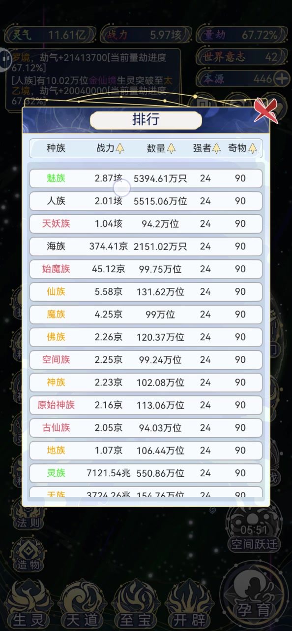 存太多种子了,然后点确认都花了不少时间,用了种子之后量劫好像过了两次,我种族就只有三个了,其他的种族都删除了(佛族基本上没活过半小时)