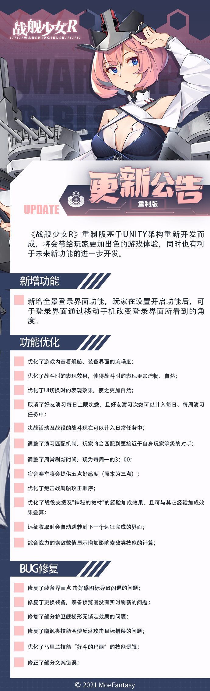 各位玩家,我们将于6月9日0:00-16:00对《战舰少女R》官方服务器进行维护,维护内容为unity游戏版本(v5.3.1)更新。维护时间暂定16小时,本次维护时间较长,且更新后需卸载现有游戏后更换新的安装包重新安装游戏。请各位玩家提前做好准备,选择合适的网络进行更新,以免造成不必要的损失。对于维护期间给您带来的不便,敬请谅解。