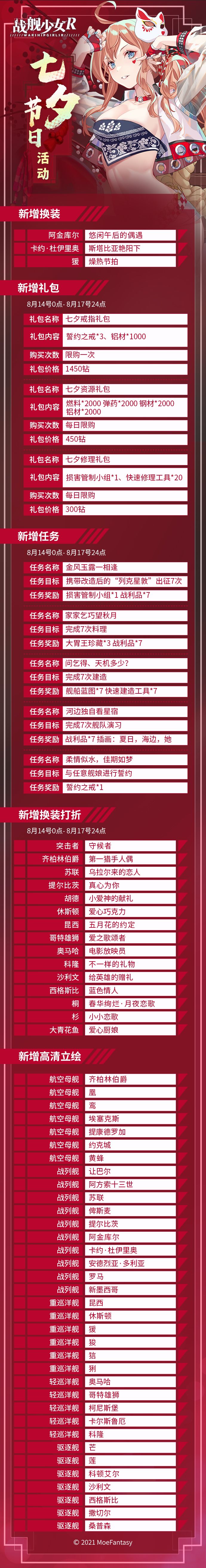各位玩家,我们将于8月13日15:00-17:00对《战舰少女R》全部服务器进行不停机更新。期间玩家可正常进入游戏【更新期间游戏内会有更新下载提示,需要玩家下载新的内容,为了避免数据异常请及时进行更新】;对于维护期间给您带来的不便,敬请谅解。 【更新时间】2021年8月13日15:00-17:00 【更新方式】不停机更新 【更新范围】全服 【更新内容】游戏内容更新