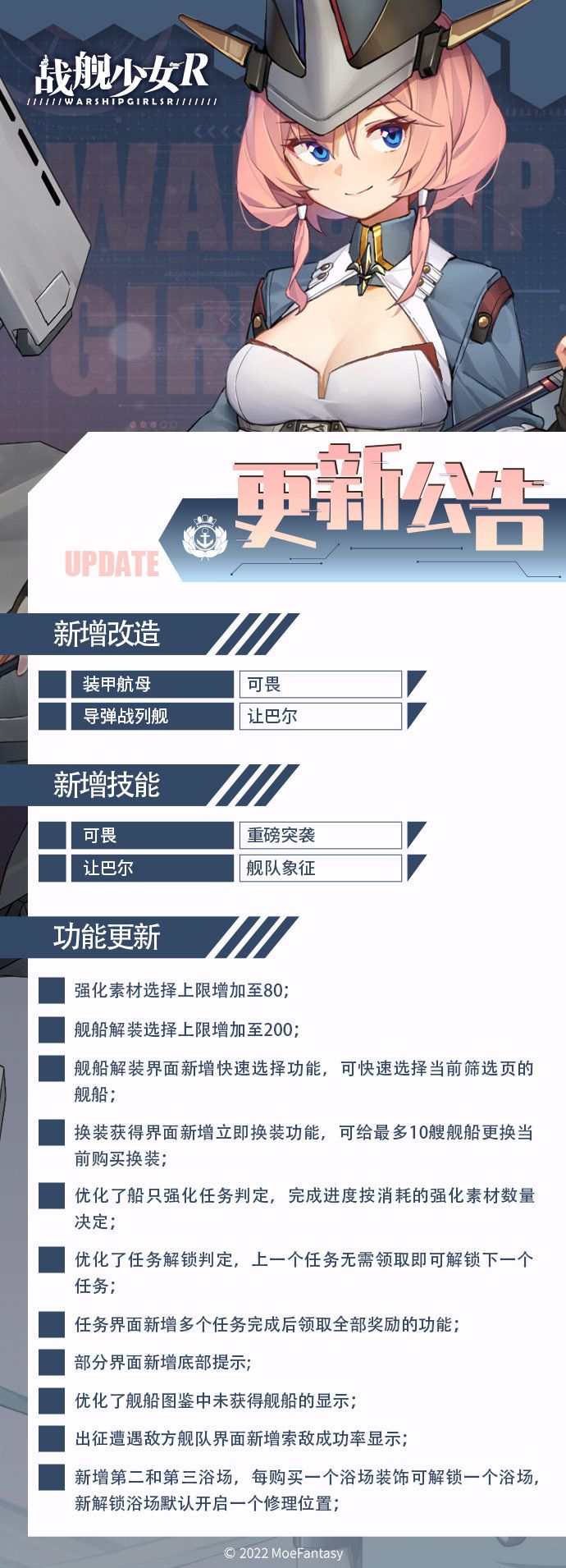 各位玩家,我们将于8月25日10:00-12:00对《战舰少女R》全部服务器进行不停机更新。期间玩家可正常进入游戏【更新期间游戏内会有更新下载提示,需要玩家下载新的内容,为了避免数据异常请及时进行更新】;对于更新期间给您带来的不便,敬请谅解。 同时,我们将于8月26日15:00 - 9月9日15:00开启舰队问答——大洋接力赛 【更新时间】2022年8月25日10:00-12:00 【更新方式】不