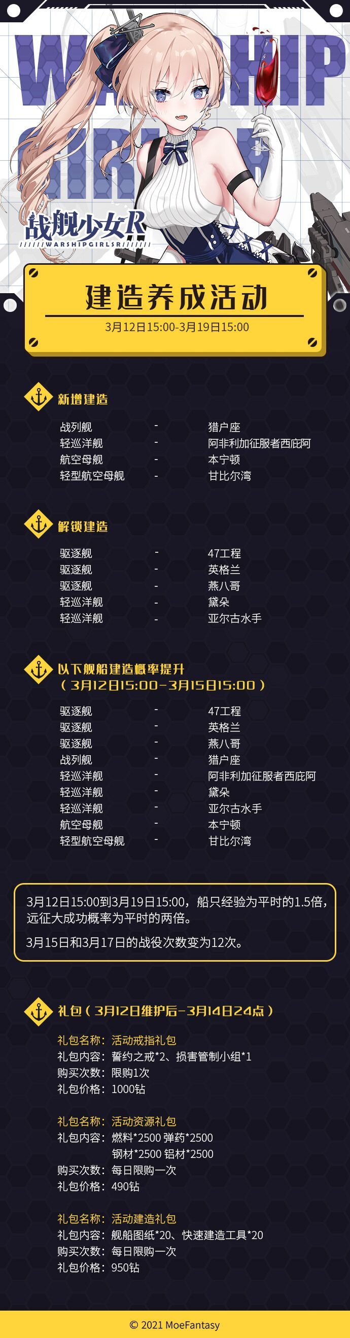 各位玩家,我们将于3月12日10:00对《战舰少女R》全部服务器进行维护 ,维护时间暂定2小时,维护内容为活动内容更新。请各位玩家提前做好准备,以免造成不必要的损失。 对于维护期间给您带来的不便,敬请谅解。 同时,我们将于3月12日15:00开启建造养成活动,具体内容如下。