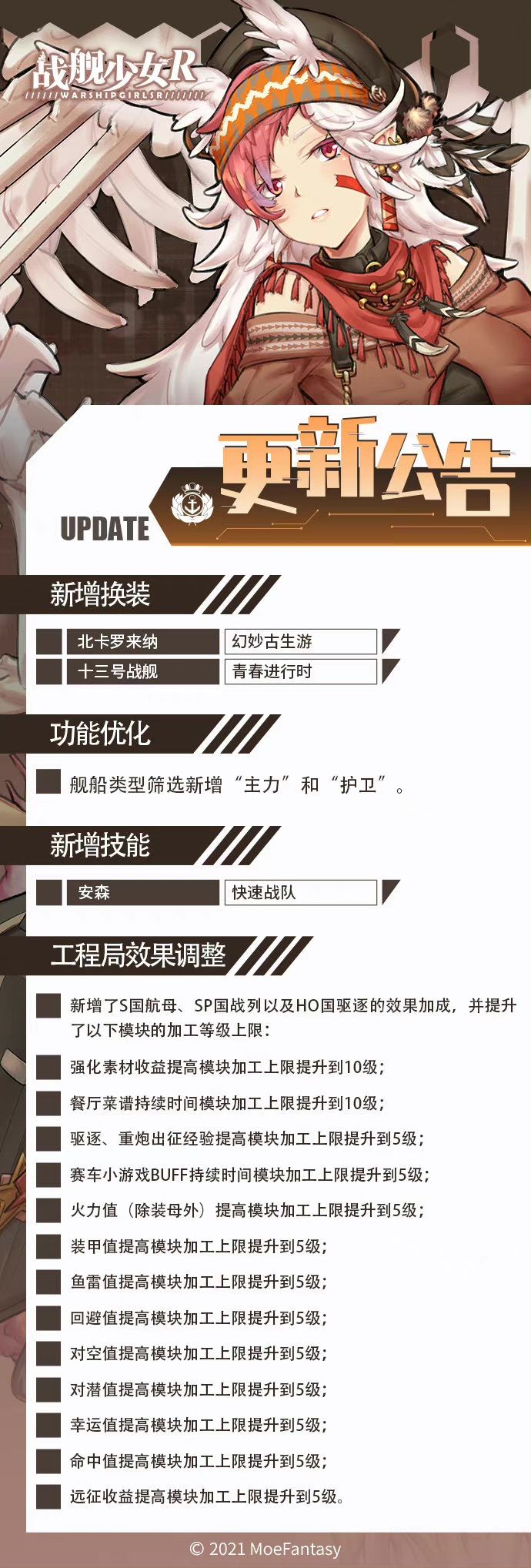 各位玩家,我们将于11月12日14:00-16:00对《战舰少女R》全部服务器进行不停机更新。期间玩家可正常进入游戏【更新期间游戏内会有更新下载提示,需要玩家下载新的内容,为了避免数据异常请及时进行更新】;对于维护期间给您带来的不便,敬请谅解。 【更新时间】2021年11月12日14:00-16:00 【更新方式】不停机更新 【更新范围】全服 【更新内容】游戏内容更新
