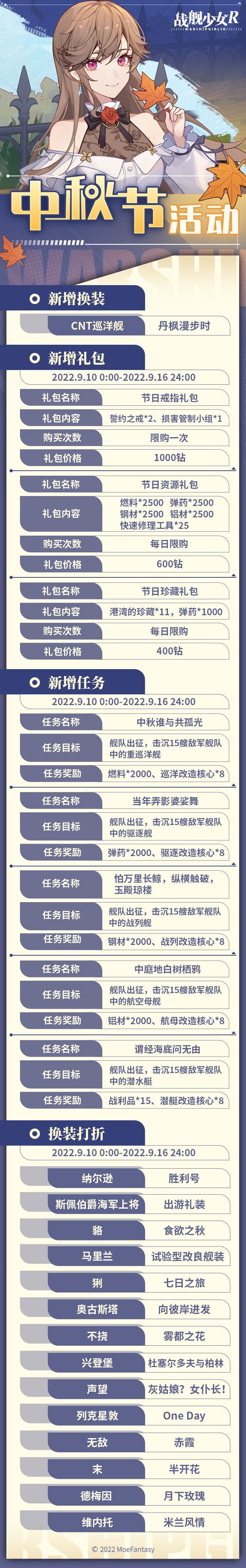 各位玩家,我们将于9月9日15:00 ~ 17:00对《战舰少女R》全部服务器进行不停机更新。期间玩家可正常进入游戏【更新期间游戏内会有更新下载提示,需要玩家下载新的内容,为了避免数据异常请及时进行更新】;对于更新期间给您带来的不便,敬请谅解。 同时,我们将于9月10日0:00 - 9月16日24:00开启中秋节日活动 【更新时间】2022年9月9日15:00-17:00 【更新方式】不停机更新 【