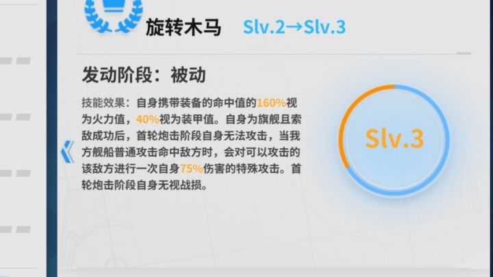 3级技能效果:装备全部附加的命中值的160%算成火力值,40%算成装甲值。别觉得少,实际加成后火力全游最高!不带30炮都能上240!装甲也是!这什么怪物啊?!哦,毛式设计啊,那没事了。日战第一轮不参与,但我方单位命中时(含航母空袭)追加一次正常伤害75%的炮击,且无视战损!但是限定自己为旗舰且要索敌成功。个人评价:没得说。T0阶再多一员,不管是攻坚决战还是带队打捞,照顾练船全部能上,一个字,弓虽