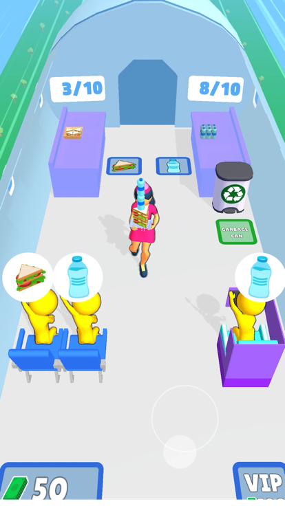 select destination, check-in passengers, serve food, clean air plane, unlock new airplanes and more...