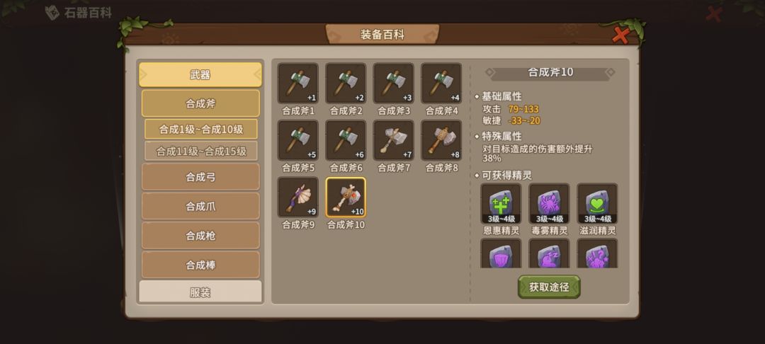 兄弟们,在石器时代觉醒中 想让自己变强,必须得将装备提升到一定的档次 拥有好的装备,才能挑战更强的boss获得更多的奖励 那么每个装备不仅有等级限制,还有独特的合成方式 就拿斧头举例 每个斧头的合成方式不同 需要的材料与精灵也不同 并且还有等级之分 分为1到10级,11到15级 防具也是如此 防具在战斗中至关重要,可以起到抵御敌人伤害的效果 为自己增加更多的防御 可以使你在战斗中游刃有余 防具分为