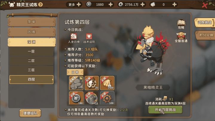 挑战词条深渊4层副本词条将按照以下顺序进行轮换。1.人龙召唤 & 战术设防2.暴龙召唤 & 共生锁链3.猩猩召唤 & 恶意链接4.鲨鱼召唤 & 魅惑5.鸡召唤 & 暴躁敌方配置黑暗精灵王(中Boss):280敏棍之勇士(右Boss):260敏枪之勇士(左Boss):290敏试练术士(右1):300敏试练力士(左1):245敏黑暗宠物:256敏前排为黑暗宠物随词条出现,并