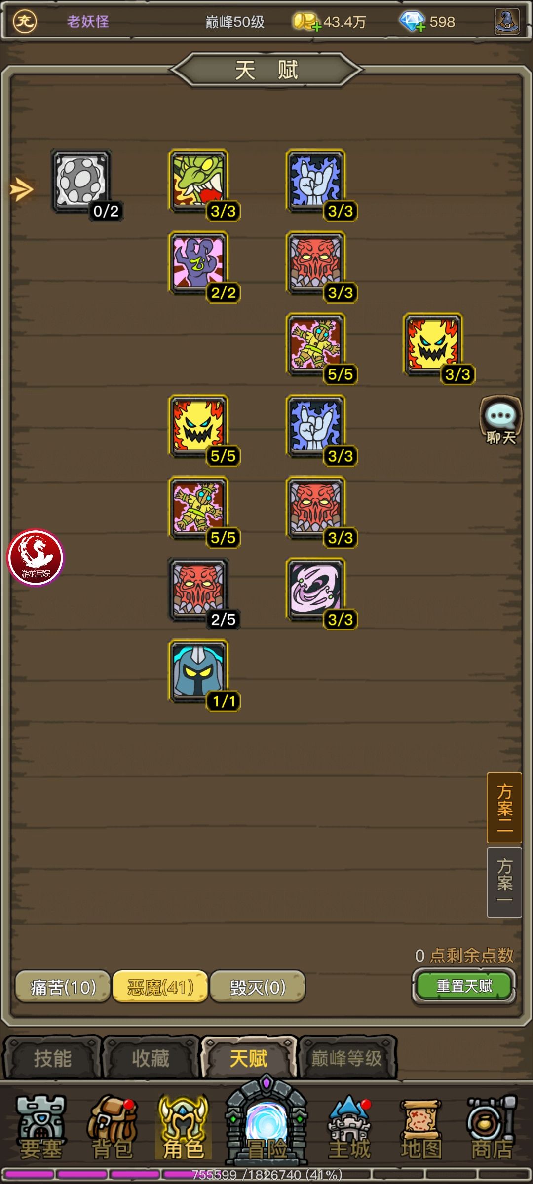 首先pvp,10/41/0天赋,痛苦10点,腐蚀术瞬发,生命吸取强化。恶魔41点,耐力+15%,智力+10%,减伤+12%,智力法伤加成20%,小鬼和守卫攻击血量防御都得到强化。最大收益就是血厚,减伤高,抗揍,pk首选。其次智力高法伤高,输出高,虽然没有毁灭天赋的暴击伤害60%加成,但是我们基础法伤高,可以通过巅峰天赋和洗练弥补暴击伤害的不足。最后,能召唤一个末日守卫,能多抗一刀。技能选择,生命吸