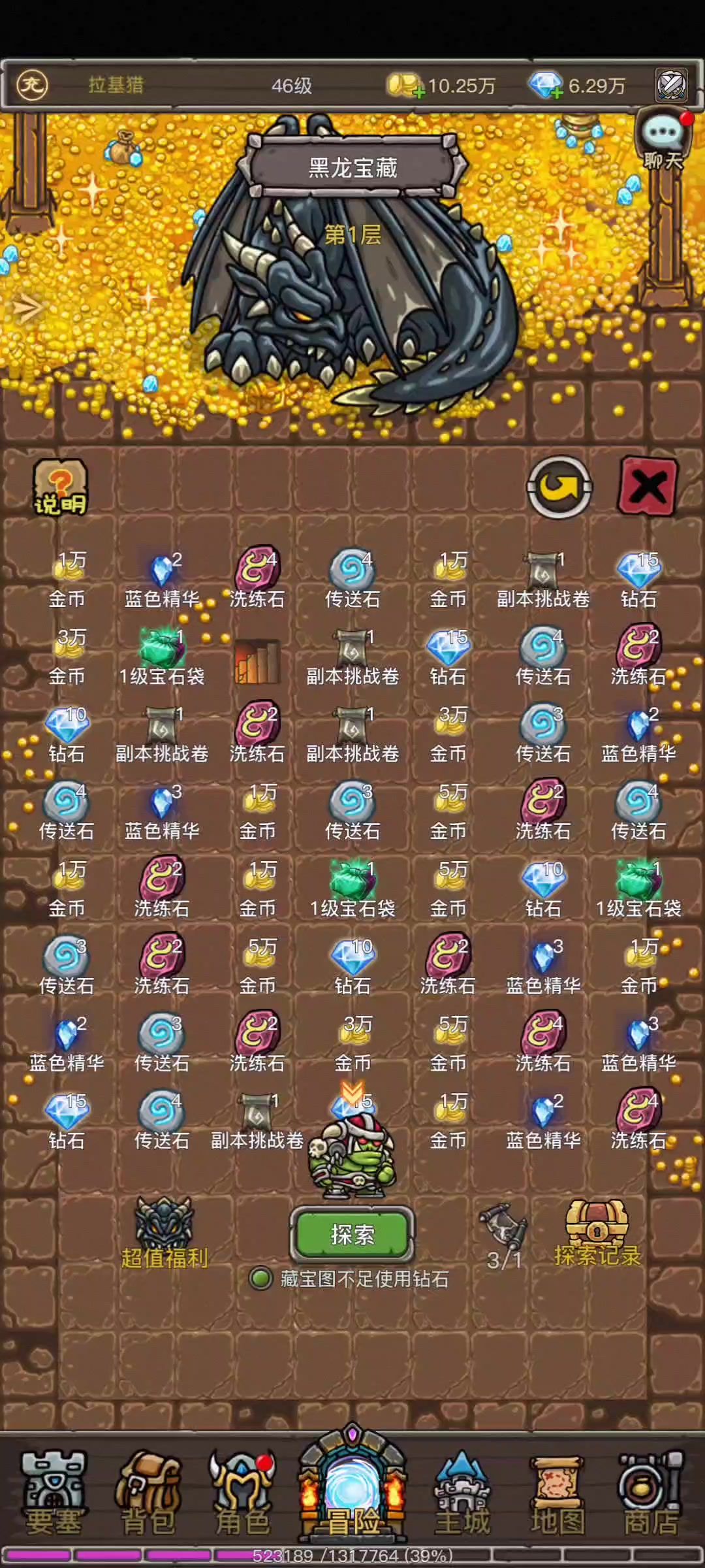 大家好我是拉基猎,最近开服钻石比较多,尝试通关到 9 层拿了通关奖励。花费差不多 6400 钻石(没用藏宝图),中间好几次直接下一层,算是运气好的。 黑龙宝藏每周六更新,主要是为了拿通关到 9 层的保底奖励-黑龙收藏品碎片,这个不能靠寻宝抽到。 5%概率直接下一层,或 25 次保底下一层,1 到 8 层能下一层就直接点一下层,保底时楼梯会发光。 藏宝图可以靠挂机获取(勾选 boss),每天 10#攻略