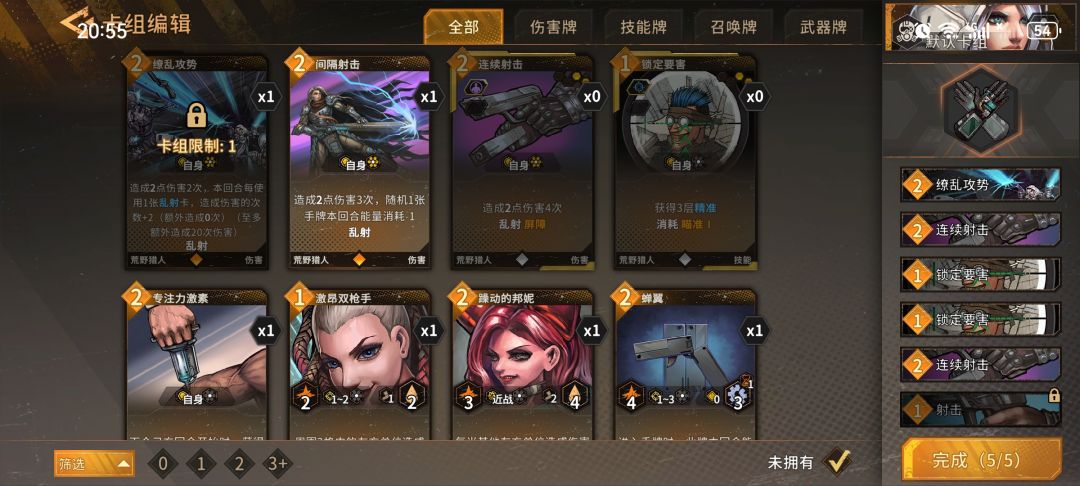 首先要说明,卡组配置应结合自己装备词条和技能词条自行调整,以下只是概述。 区别于以精准翻倍为核心的极限伤害玩法,纯乱射流下线更高,并且不依赖遗物。现在的环境下,日常最难的极限难度极限试炼最终boss也只有几千血,不需要追求太高伤害。 理想情况下卡组里面只有以下六种卡:缭乱攻势,连续射击,间隔射击,锁定要害,应急物资,战斗回响。 开局从以上六种卡里面选五种,各带一张,词条选择:追求伤害就两张带