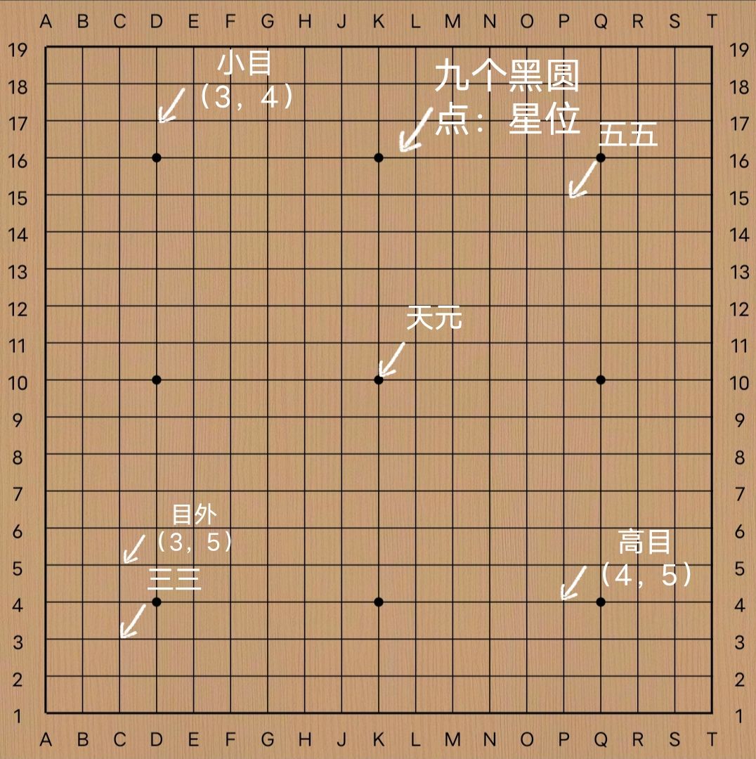 入门篇我会分为这些来写: “入门-规则”“入门-行棋”“入门-术语”“入门-技巧”“入门-布局”“入门-官子” 之后会依次更新初级篇,中级篇,高级篇(这个我会尽力写好) 以下侧重定义,下法在以后其它篇章可能会有 一 点位 棋盘是对称的,也就是说一个角有两个小目,目外,高目的位置。 二 打吃 当你落子后,敌方的棋仅剩一口气,这个行为叫打吃 三 对杀 当两块棋都被作不出两只眼活棋,互相收气拼杀,叫对杀