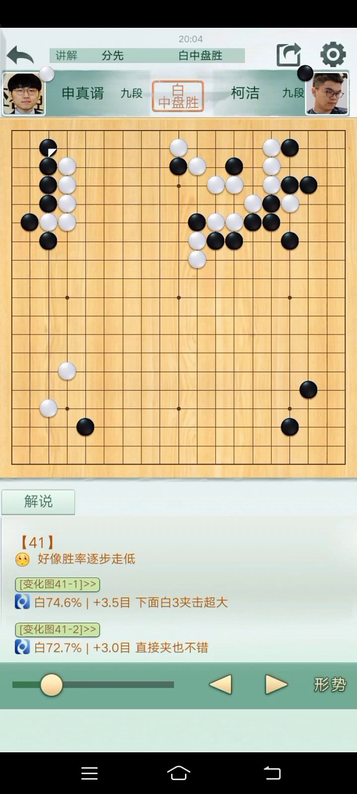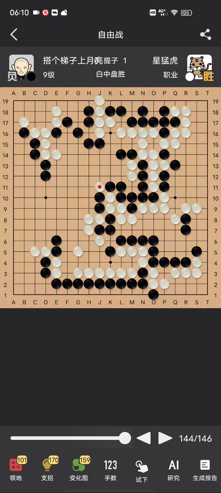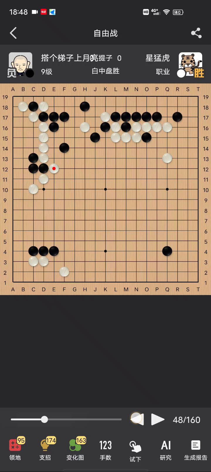 感觉黑好被动,一直被牵着走。右下白小飞之后其实应该拆一下的,因为脱先左上然后一直没回去补所以后面才,,,左上双飞燕,白立守角之后,边上那里其实也应该拆一下,不然被白夹一下会很难受,虽然白没有没有这么走。后面的行棋中双方好像都忽视了左边,,,脱先过来拆一下,一下好几目呢,,,左上虎的那一下挖不好,,,白一立,补下边也不是,分断也没断成,,,挺难下的上边,,边上没守好就大挂角被打入,,,两个连飞声东击西想吃那一块没吃成,,然后左上白又有实地,又没被封死,两个飞算下来的目数屈指可数,,,中间封不住的时候其实应该脱先走左边,然后被他嘎嘎两下直接给右下杀光了。右下那个飞盖,,哎,没盖住,,,,后面的连爬估计是心态已经炸了,,,『七子延边活也输』,,不连着爬角上也不会被他立两个,中右那一块也能跑,,