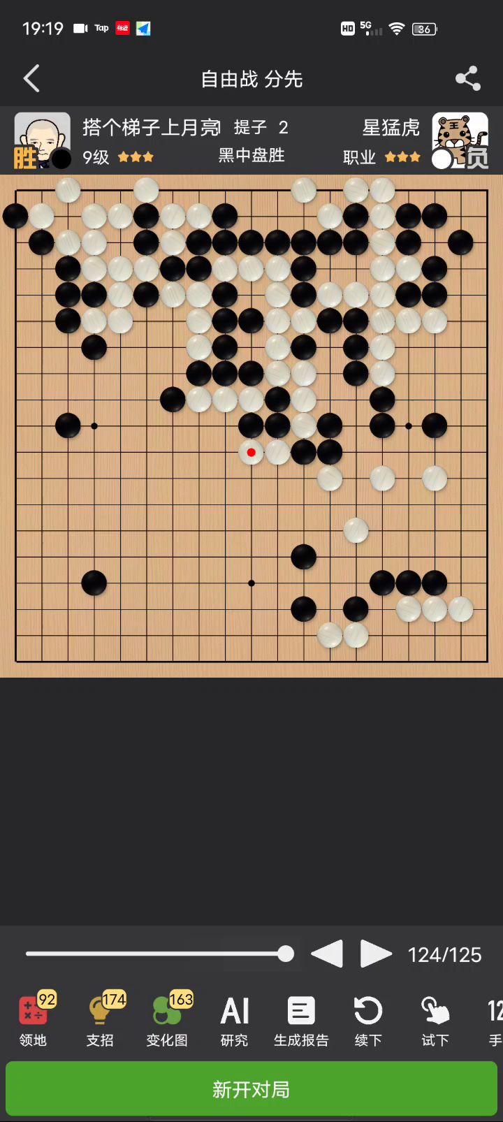 三个问题,左上角进攻价值小,早应该脱先了;右下角犯病亏损巨大;右上角那些交战的子就是个坑,谁吃对面就弃子反而亏损,我应当弃子 (其实我是有故意给黑棋破绽让他吃我来弃子的机会的,奈何黑棋不为所动)。然后最后打入我用ai推演了两次,两次都死光光。