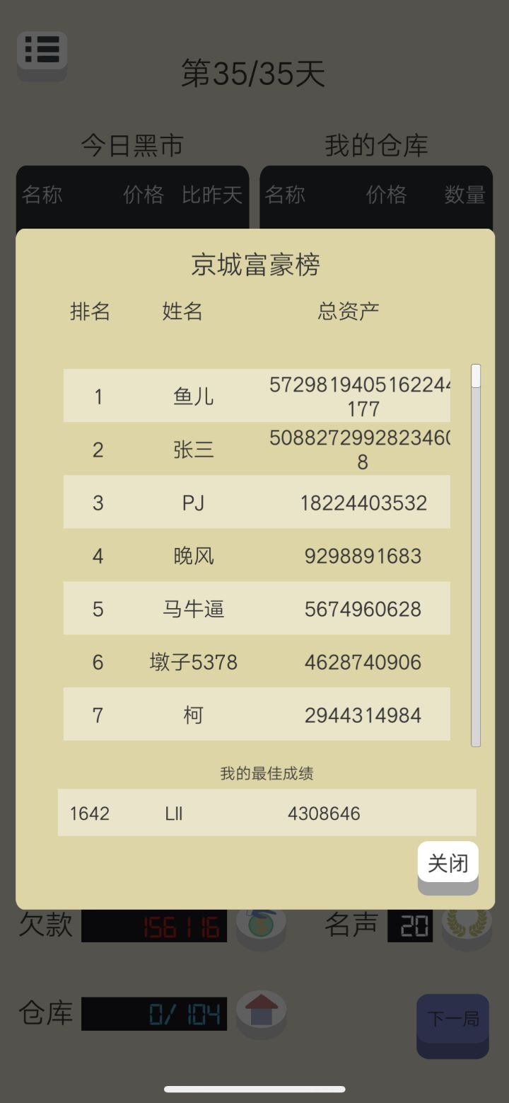 第一次乱玩 后面怎么玩都打不破第一次的430w😂其实就相当于第二人生类型的文字类型游戏 只有35天短期买卖