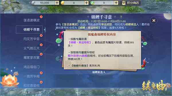 网易角色扮演治愈系MMO《镇魔曲》全新“秋水渡缘”系列活动正在火爆进行中,莲花灯寄心语、捞锦鲤得特权等福利奖励多多,更有夺宝活动每天爆棚、1元宝抢下绝版外观!1元宝拼好运,夺宝活动人山人海每天都有夺宝,1元宝抢绝版外观活动期间每天晚上20点至22点,“月见芳华至”活动都将准时开启、让天命者们能花费1元宝参与绝版外观的夺宝玩法!只要运气爆棚,就能在众多天命者中脱颖而出,收获当天的绝版外观及海量