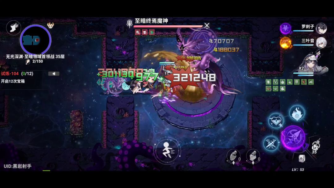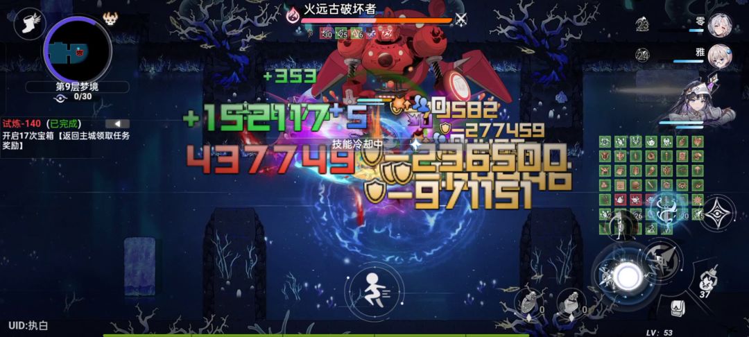 为了打的稍微快点让水魔女换了三叶,为了模拟boss高伤害盾换了个怒火,带了两个烧血大招