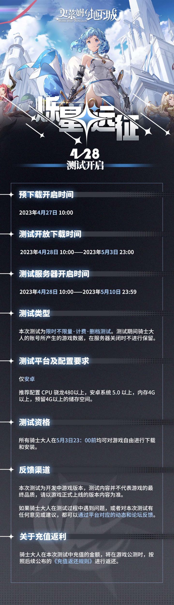 预约地址:在各位骑士大人的千呼万唤之下,试玩机会即将到来~史莱姆与地下城「烁星」测试,将于4月28日开启!黑雾弥漫的阿姆斯地下城依旧充满危机和挑战;但「你」所不知道的是,在听到呼唤的那刻,命运的舞台已悄然拉开帷幕......测试的相关内容已整理完毕,请骑士大人阅读下方长图的信息充值返还公告*更多资讯,请留意正式服论坛的官方推送正式服论坛的通知有抽奖哦,记得参与: