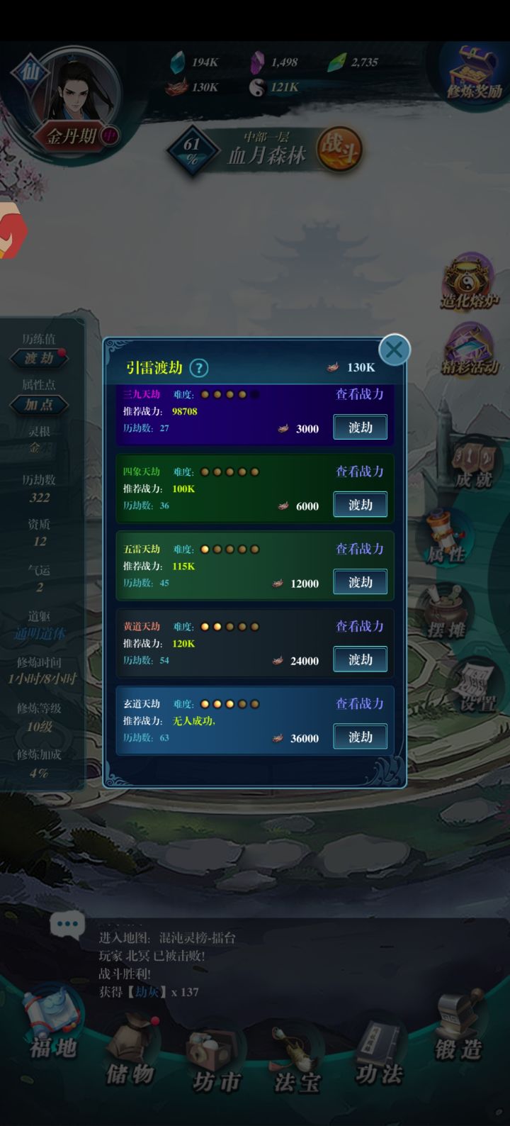 刚进游戏是不是感觉贼难? 渡个劫死成狗了?道友莫慌,听我娓娓道来进游戏老规矩加群礼包领一遍,凝气后期就可以兑换了, 送的神器礼包可留可不留,反正筑基都可以做套装了,雷劫过不去就推图,推不动为止, 活动和副本次数也留到晚上收尾再搞。筑基之前全选三九雷劫,好多小伙伴是不是进去就被围殴致死? 莫慌,死了就再进, 运气好进去怪没集中被集火就可以磨过去,凝气后期三九雷劫2.6万左右就可以过, 凝气到筑