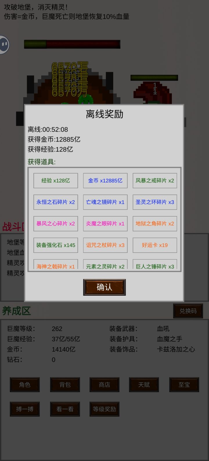 也就刚开始玩玩,等你想存10万亿买装备,那你会发现离线给的奖励是在线的1/3,这图片我已经升级好多了,也买了一件10万亿的装备了,如果离线你最少10个小时无事可做,后面更离谱