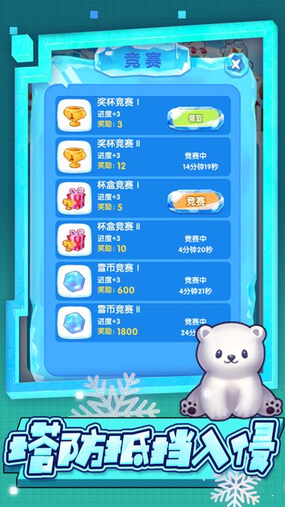 挑战竞赛,获得更多雪币,冰雪动物升级也会获得等级奖励哦!