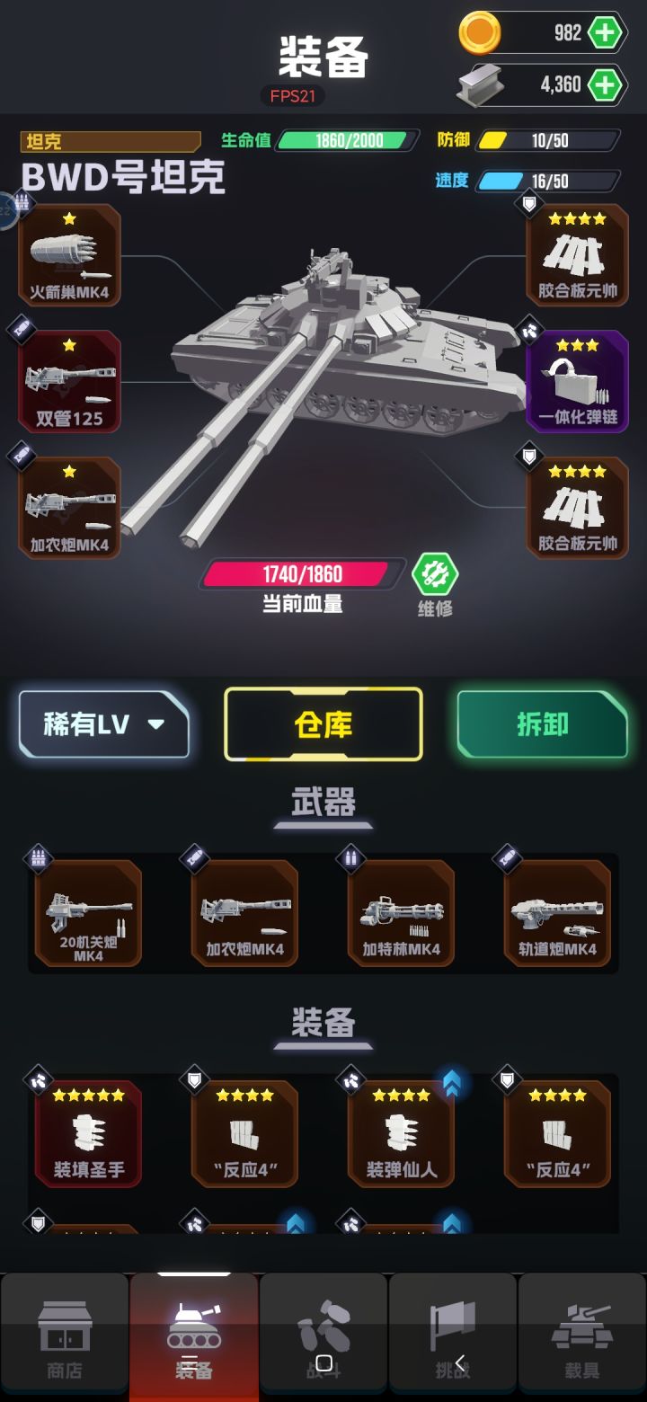 养成主要是装备系统,武器装备有品级和星级设定,同时还可以解锁战车装备槽位,以便于装备更多武器,针对于不同的地形和敌人。但整体养成深度并不深,像是小游戏的养成方式。