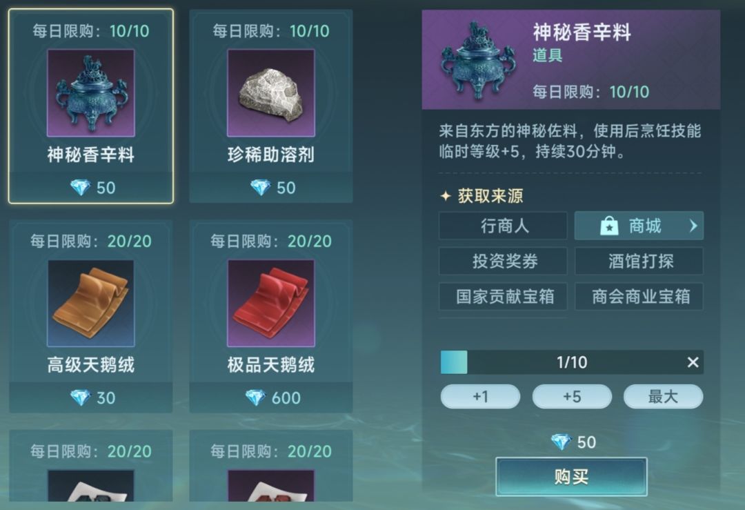 烹饪是生产的开端,没有经过万猪斩的厨师不是合格的厨师。先以烹饪说起,抛砖引玉。 先从一个道具说起,神秘的香辛料,如图所示。其实这个道具通过做任务也会送不少,完全够用。有这个道具会很方便,没有也不影响。我们按部就班,以英国为例,生产交易品练烹饪,生产交易品要到各港口的生产工坊委托生产。 1级 多佛 小麦变面粉 鸭变蛋 2级 海尔德 羊变奶 鸡变蛋 3级 海尔德 鸡变鸡肉 羊变奶 4级 希洪 猪变猪肉