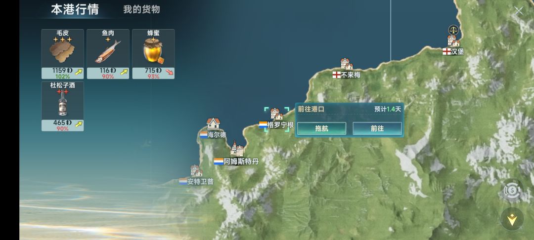 各位萌新商人们 要是实在不知道怎么抓流行 建议可以跑黄金航线 比如北欧区域近港的格罗宁根蜂蜜航线,价格波动 箭头是当前市场浮动 红下就是市场热度衰退 黄右上就是市场热度持续上升 百分比是指当前商品在目标港的出货价与本港购货价的浮动比 不介意时间的可以跑远港 理论上远港比近港收益高 比如后期的跨洲香料航线
