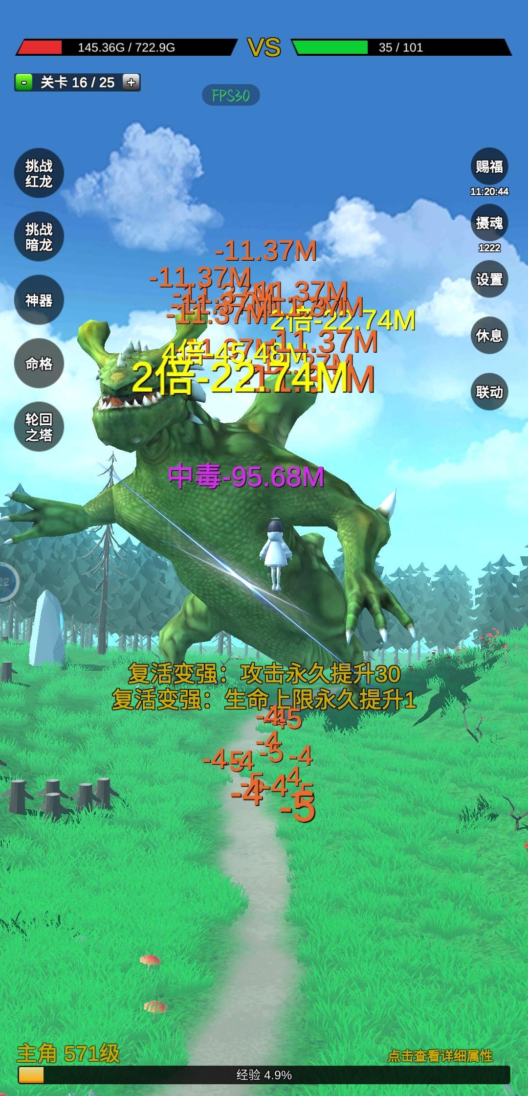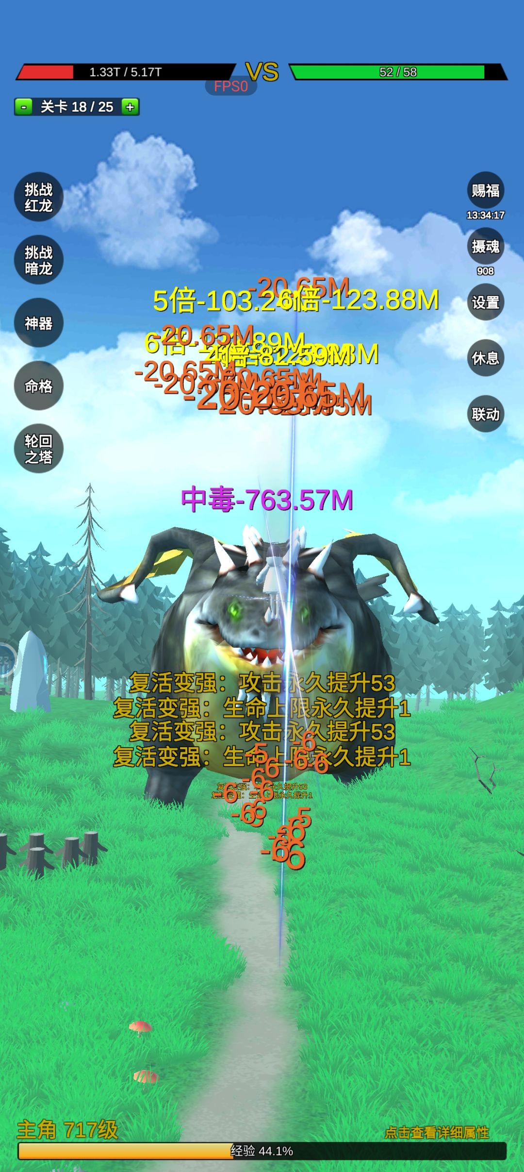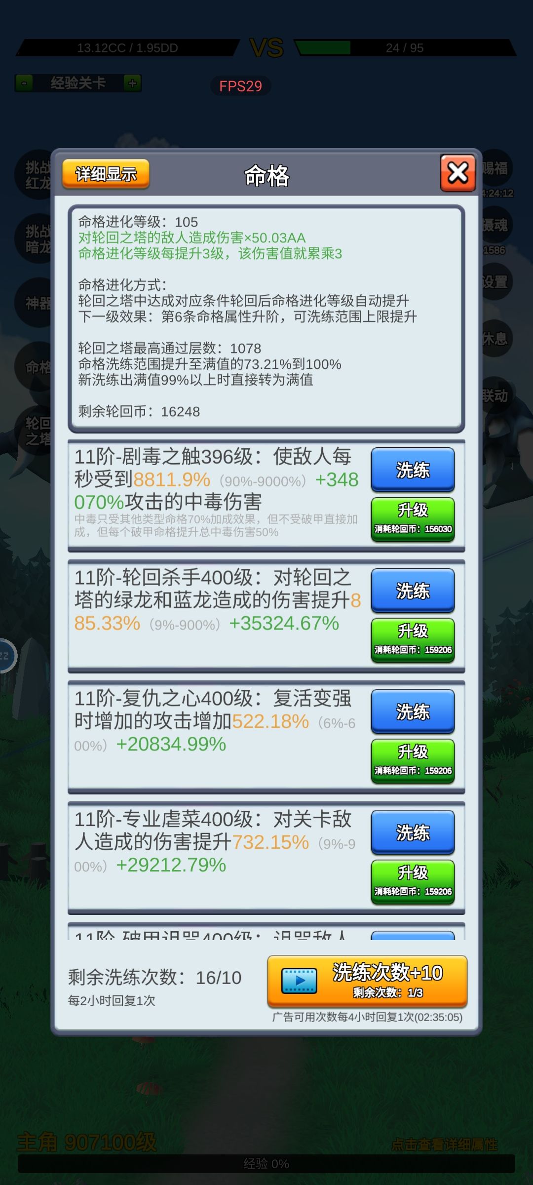 一:游戏介绍 本质是一个挂机游戏,玩法简单,挂机就能变强,不用氪金,无脑变强,快乐就是这么简单。 二:关于前期 1.开局先赐福,再摄魂。 2.快速过关,不要卡在低关卡 3.红龙和黑龙能过就优先打 4.体验命格一定要用,选择毒,名副其实3转前最强命格,只要一直挂机就能变强。 5.通关25层后,立马打轮回,能打过命格进化层数就能去轮回,不用盲目追求高层数,以后的路还长,现阶段就是快速轮回,获得命格。 三