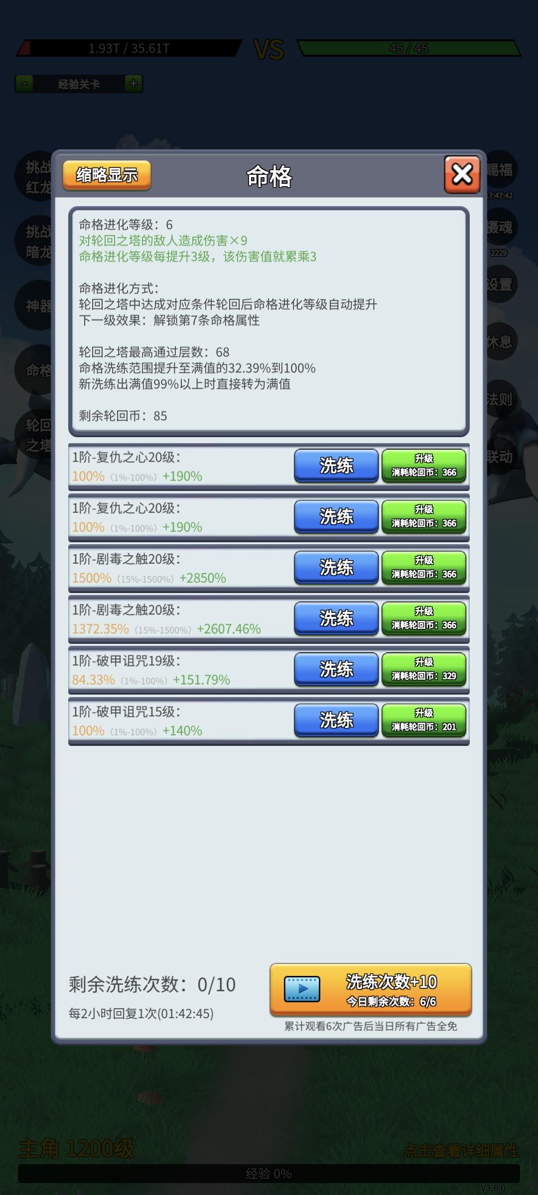 碎碎念:无限复活终于可以发长帖啦!上线后先赐福后摄魂 试用命格首选毒赐福:每天看两次广告 赐福一次12小时内可享受每秒自动攻击15次 主角死亡后立刻复活变强(游戏的机制就是不停被打死 死后重生变得更强)摄魂:每天看10次广告 每看一次广告后可免两次 很良心 有木有 当天看完10次广告后 剩余次数全免之后打完25个关卡就出新手村啦(别着急进入经验关卡 先打轮回塔)打完10层轮回塔后 选择